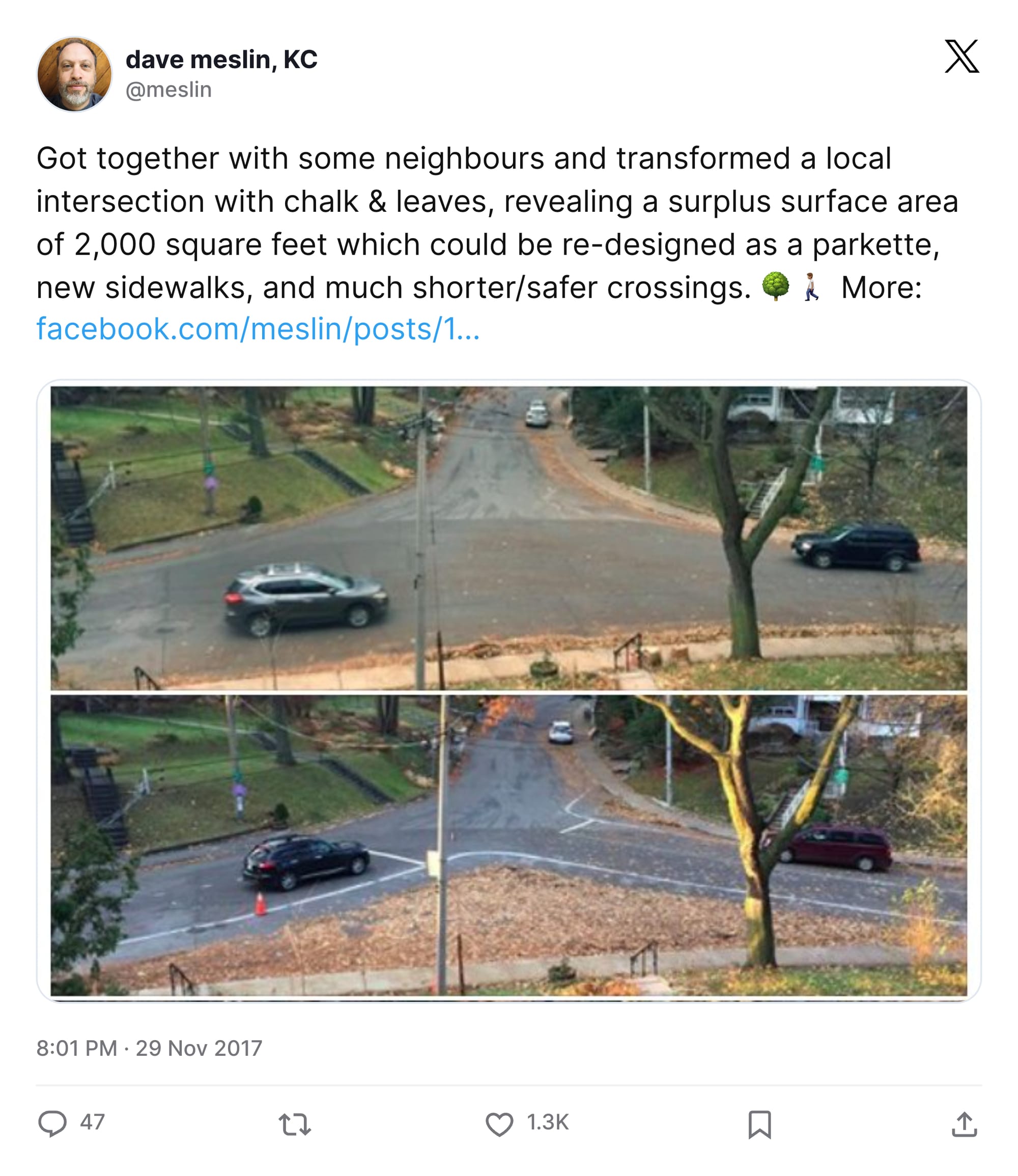 Those of you who live in non-snowy places don't have to be left out of the fun. A similar phenomenon emerges during autumn when the ground and streets are covered with leaves. (I regret to inform you that this is called a "leckdown.") A few years ago, a neighborhood used leaf patterns to draw their own revisions to a local intersection.