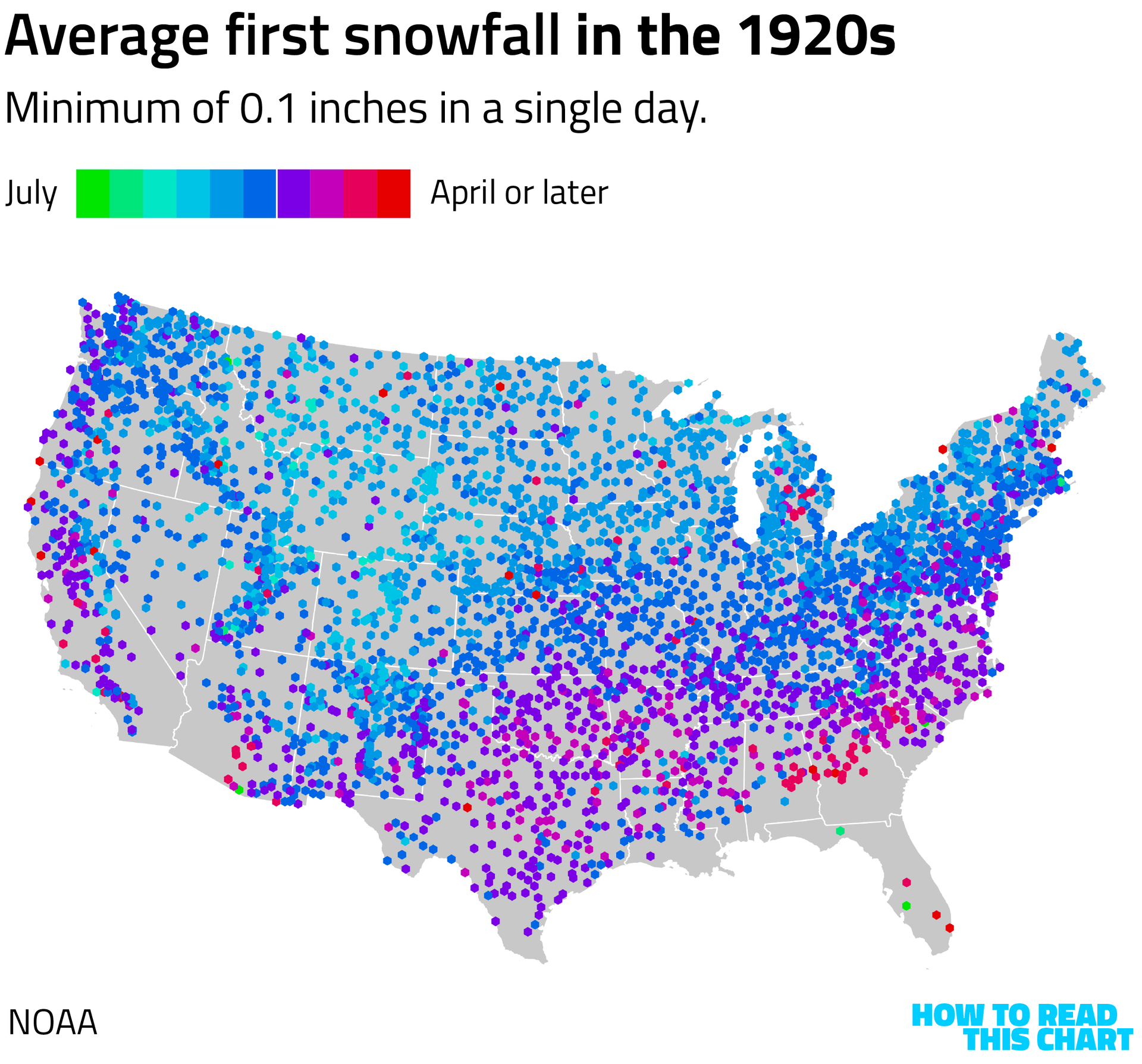 There are a few important caveats here. The first is that each station is or was in operation in a specific place for a specific period, meaning that there are often gaps. Another is that "first snow" is itself relative. Are we talking a dusting? A foot? As you can see, I set a baseline of a tenth of an inch, enough to cover the ground but not requiring an actual blizzard.