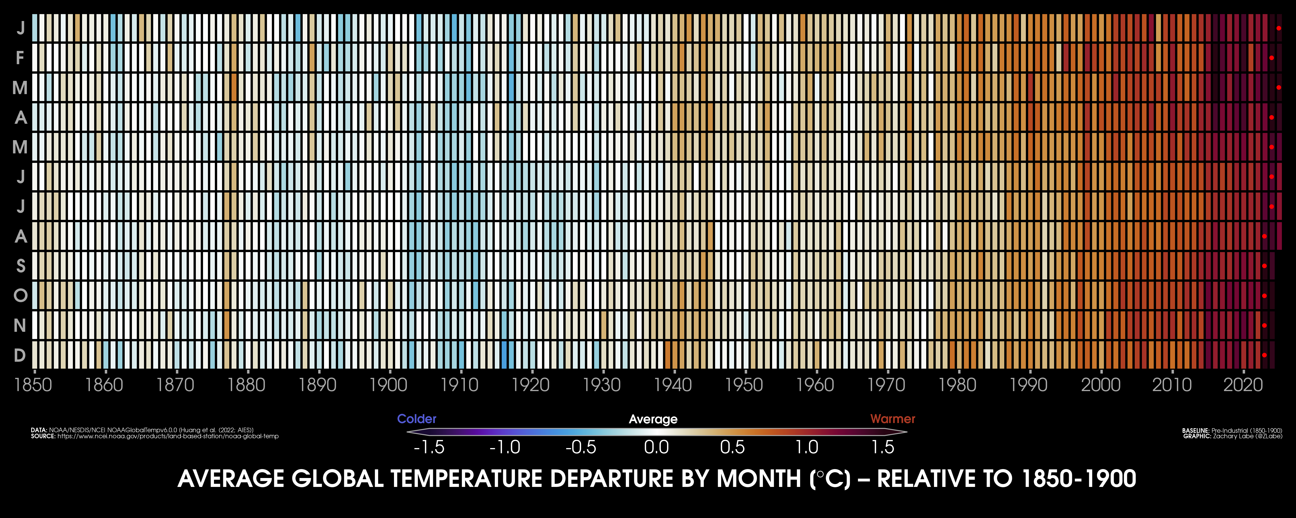 "As you scan left to right," he wrote, "the long-term shift is obvious as the colors move from blues into deep reds. Earth is warming. I also mark the warmest months with an extra red dot to highlight that the hottest periods have all occurred in just the last few years."