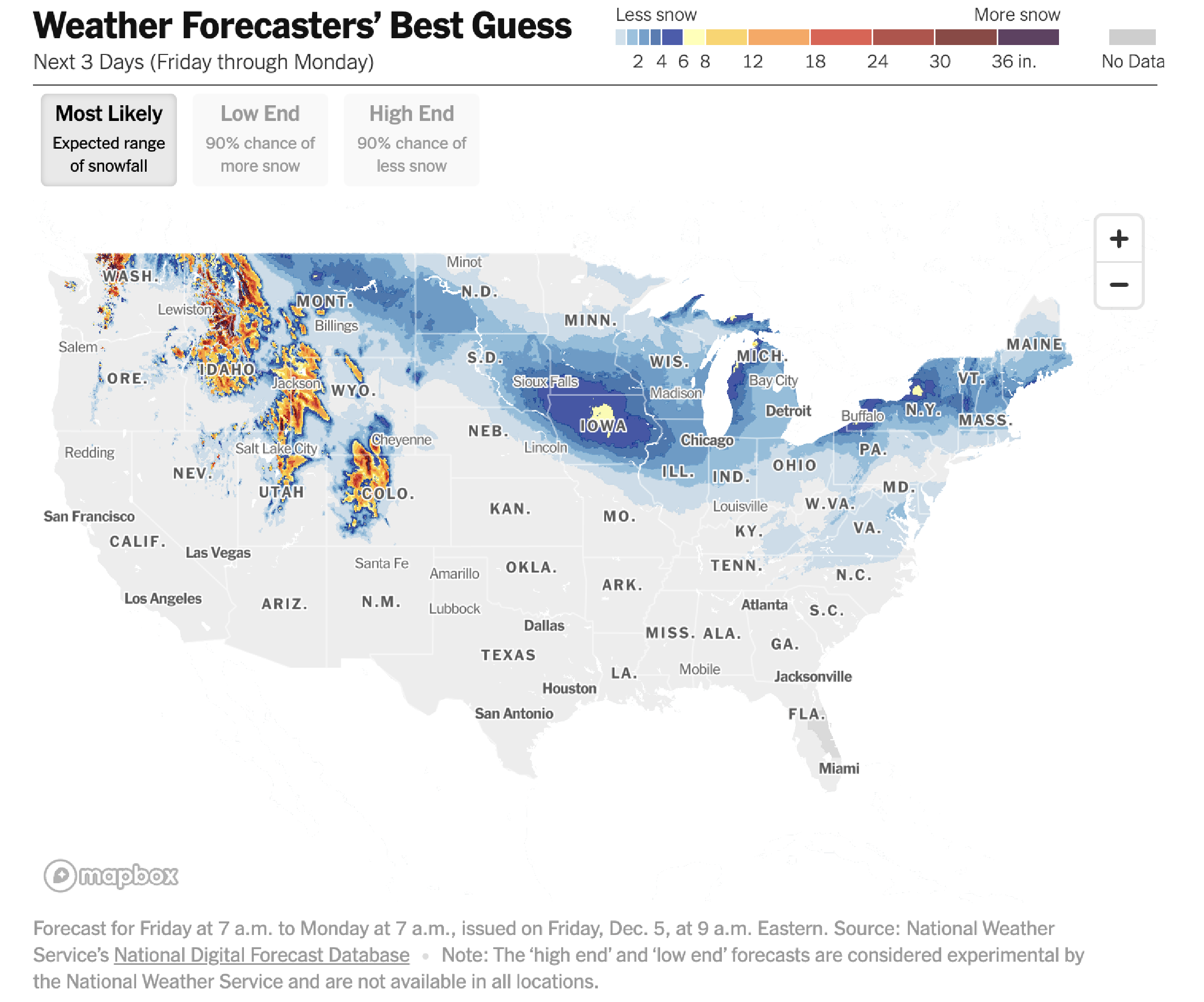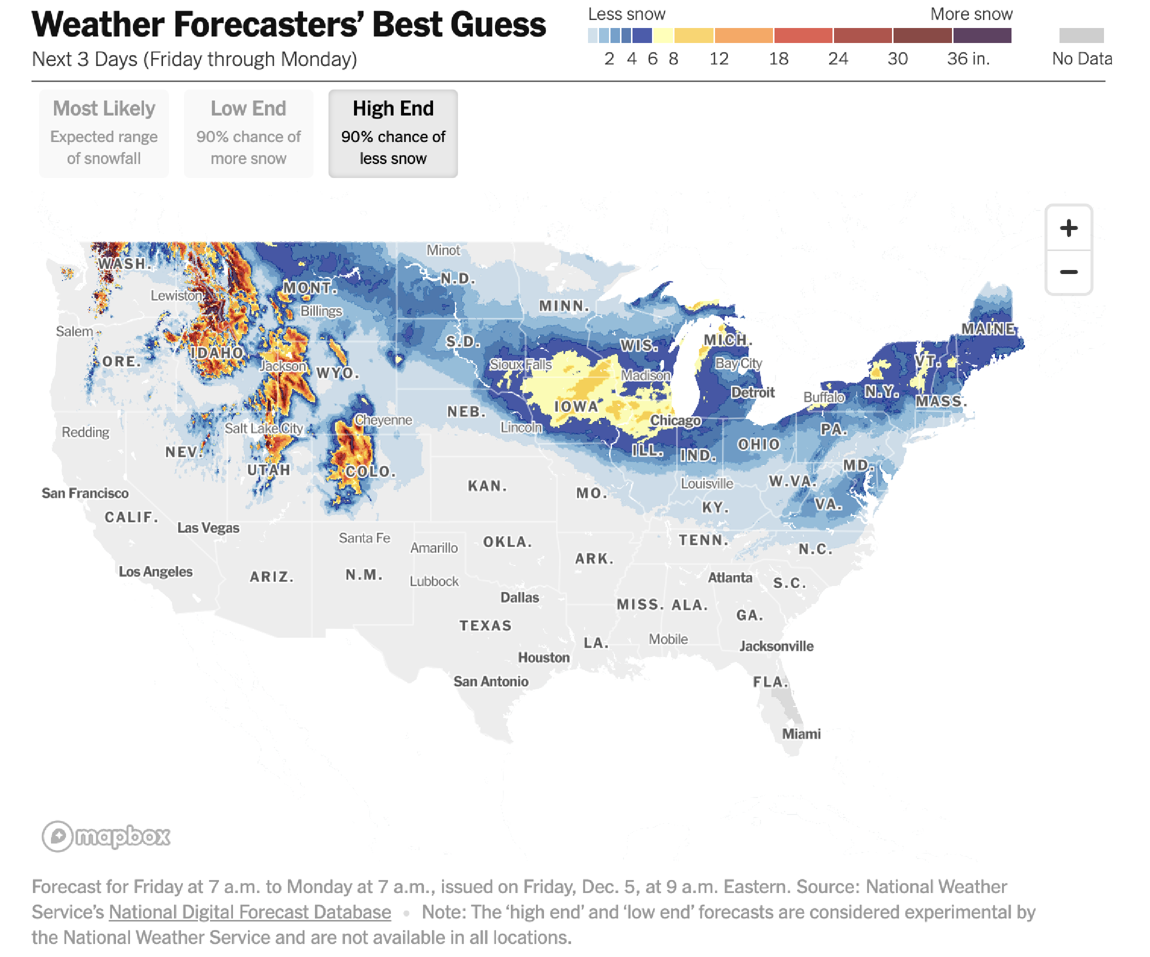 One thing I appreciate about the Times map is that it also includes high- and low-end estimates of snowfall. It's both rigorous and useful: snow enjoyers and snow loathers can each envision their ideal worlds.
