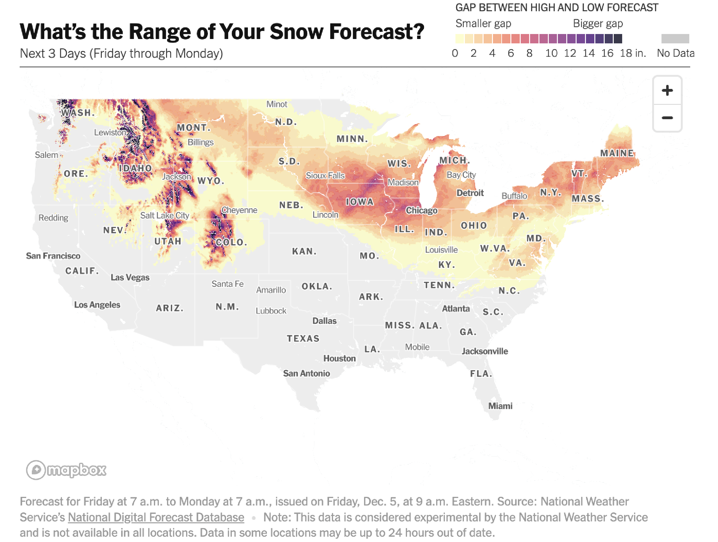 Having an estimate range also allows the Times to present a map of the ranges of expected snowfall — functionally a map of predictive uncertainty. Of course, it is also a map of how wonderfully bonkers snowfall in the Rockies is. Maybe you'll get two inches or maybe you'll get 20. Guess you'll have to wait and see!