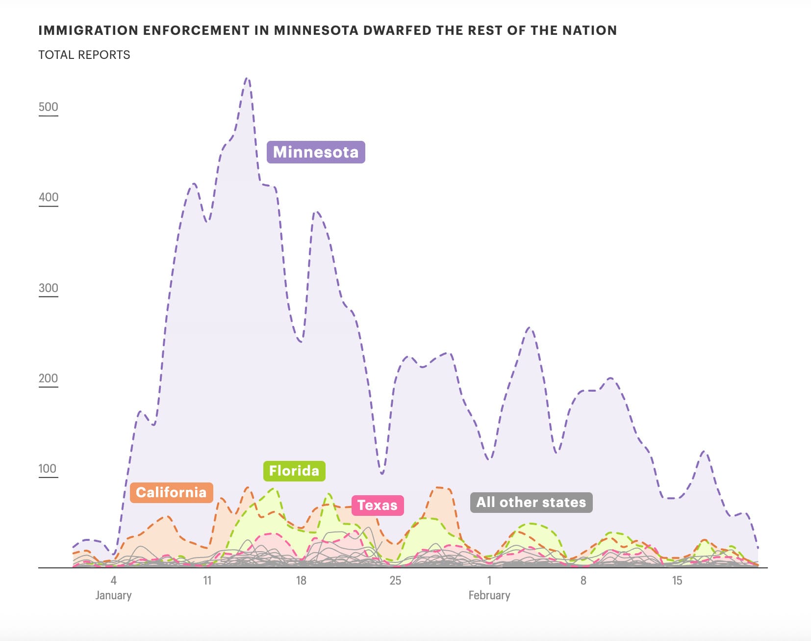This is self-reported data, but that also tells part of the story. Residents of Minneapolis quickly organized to track and report immigration actions, with the effect of providing a better picture of what actually unfolded.