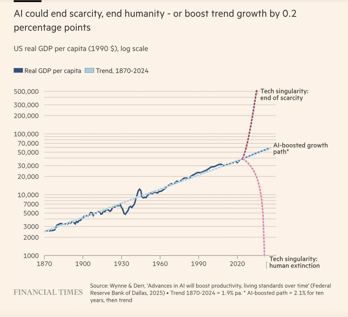 Which brings us to an all-timer chart from the Financial Times, explaining that AI will either obliterate the economy, end all human suffering or slightly increase economic output.