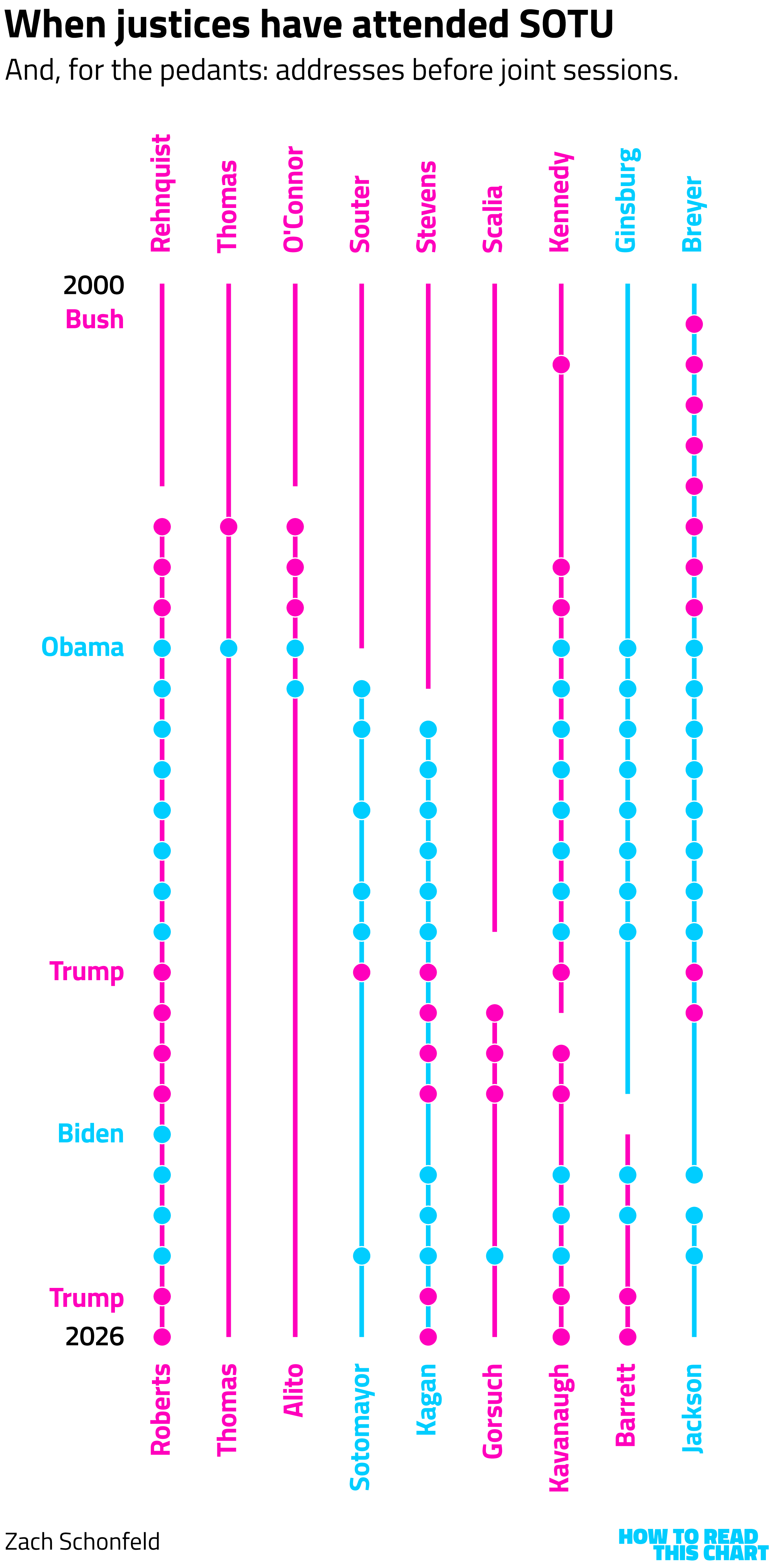 Happily, The Hill's Zach Schonfeld has been compiling that data. I made a visualization, showing which justices have attended since 2000 (when none did), tracking seats as they changed hands after deaths and retirements.