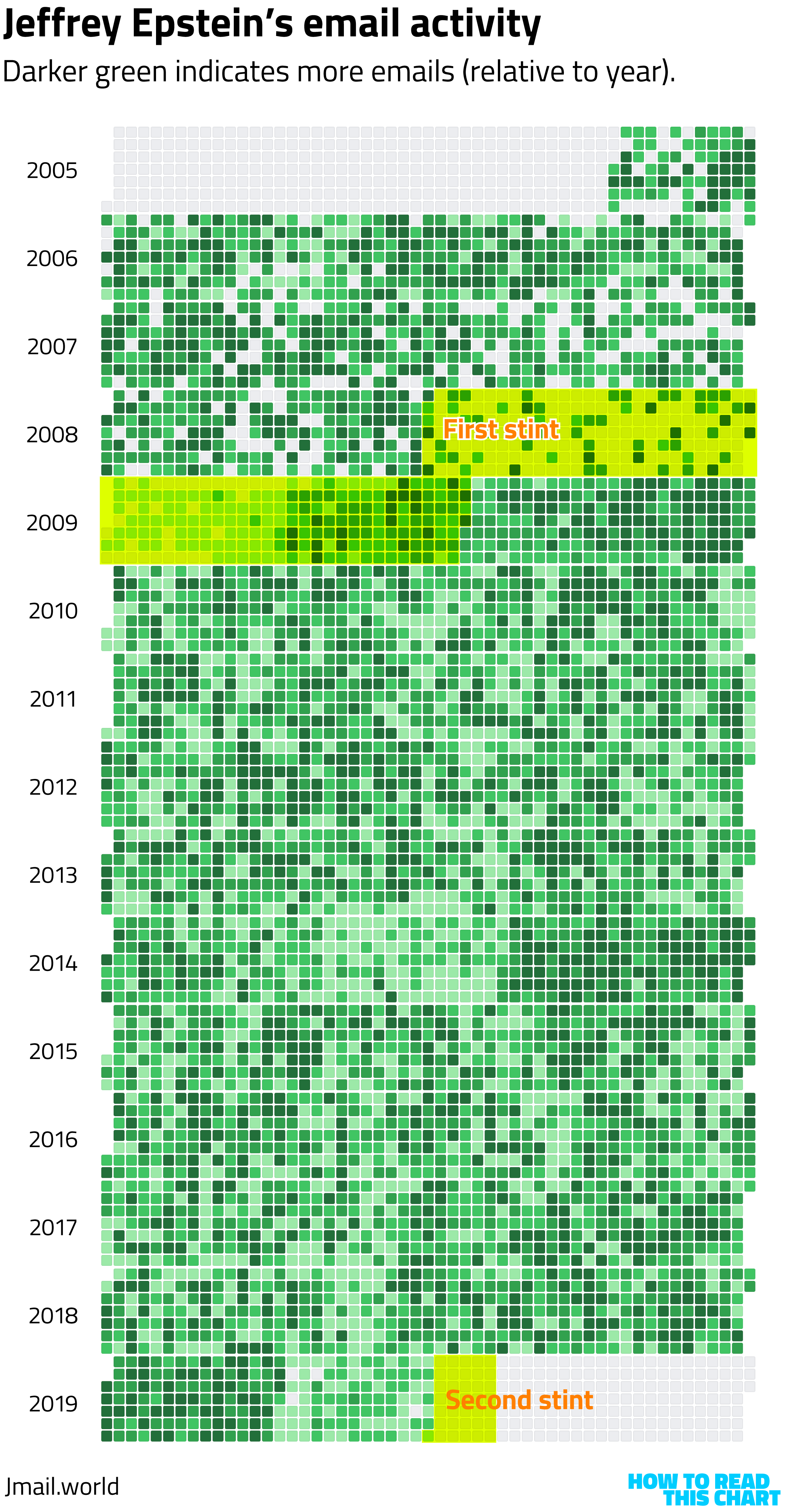 It's not solely an inbox. The site also includes information about patterns in the messages and popular communication partners of Epstein's. I appreciated its year-by-year visualization of when the email account was busiest. It allows you to see, for example, how his email activity dropped off when he was incarcerated in 2008-2009 and again in 2019.