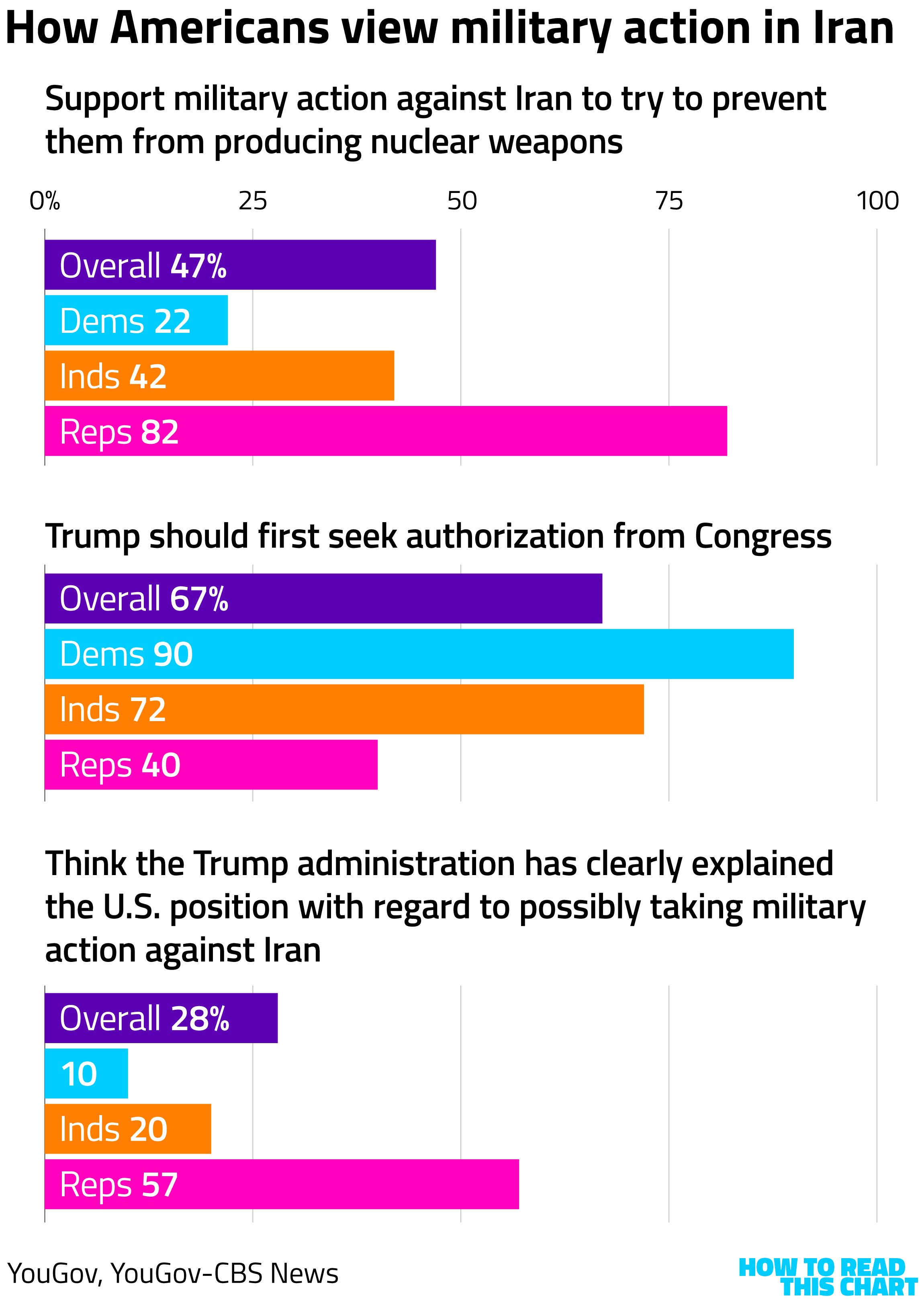 As you might expect, given the lack of consensus-building, polls show that Americans are skeptical of Iran strikes. Even when YouGov asked narrowly about curtailing Iran's putative nuclear weapons program (as opposed to a full regime-change play), less than half of Americans supported strikes. Two-thirds of Americans thought Congress should authorize any such action (as Bush sought before the 2003 invasion) and basically no one who isn't a Republican thinks Trump actually made the case for strikes.