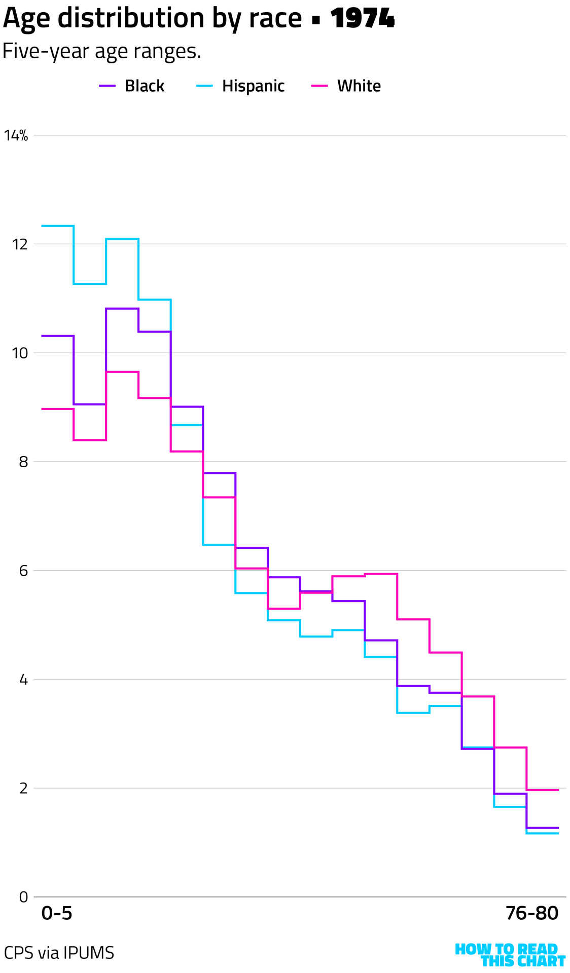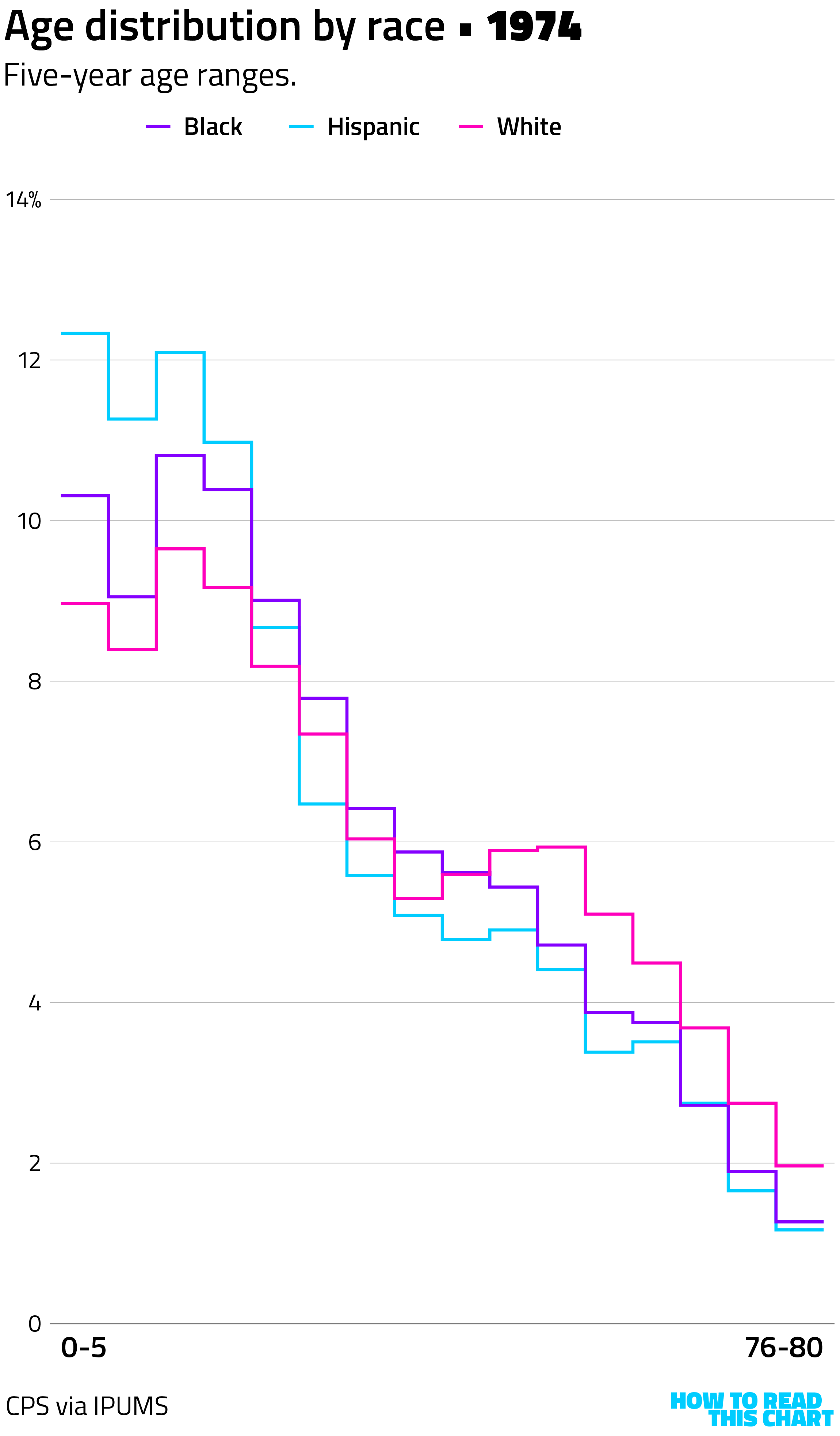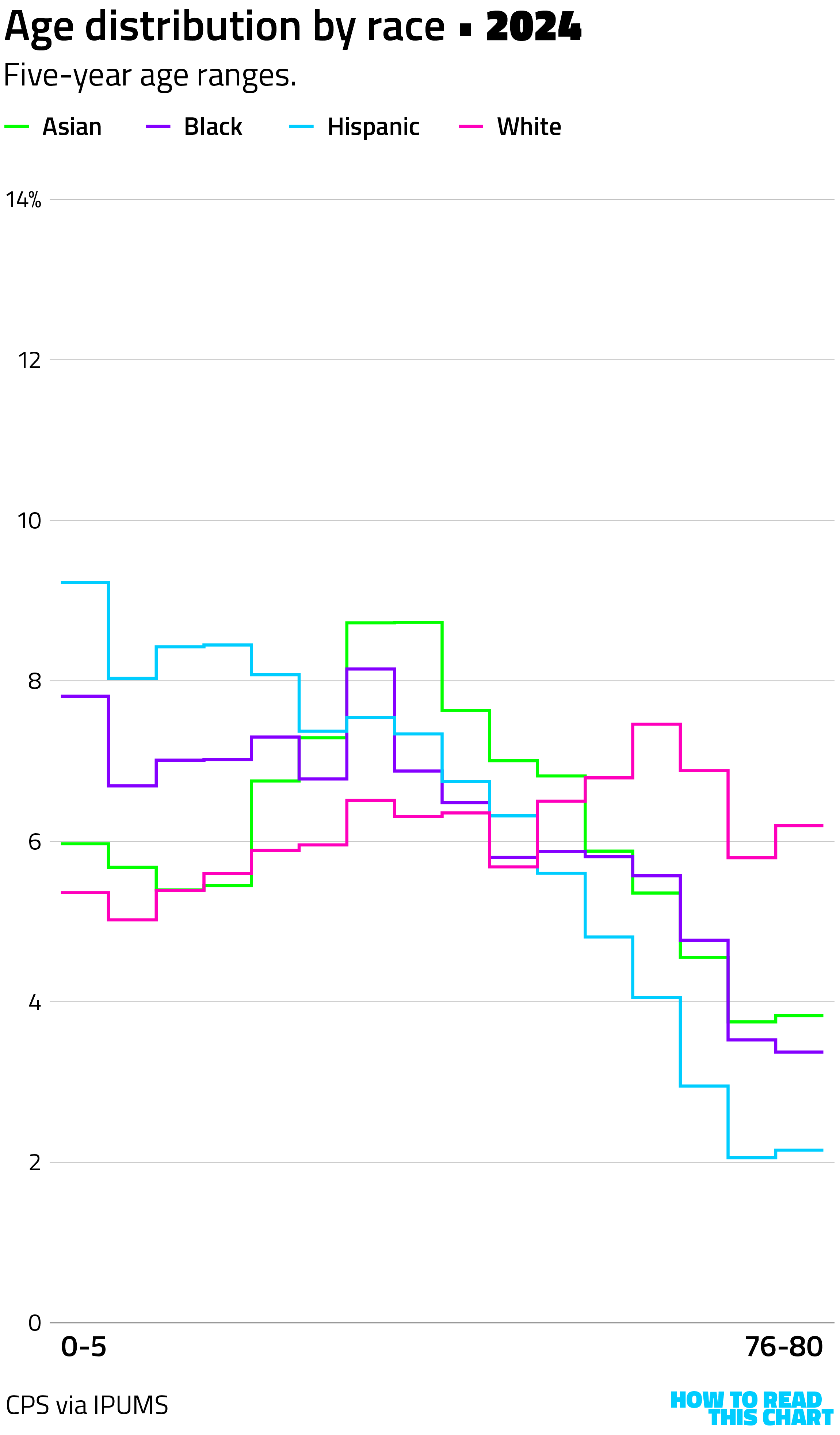 You can see that on the chart below: the White population in the U.S. skews older while the Black and Hispanic populations skew younger. (Here and on the charts, I'm excluding Hispanic Americans — considered an ethnicity by the government — from the Asian, Black and White racial categories.)
