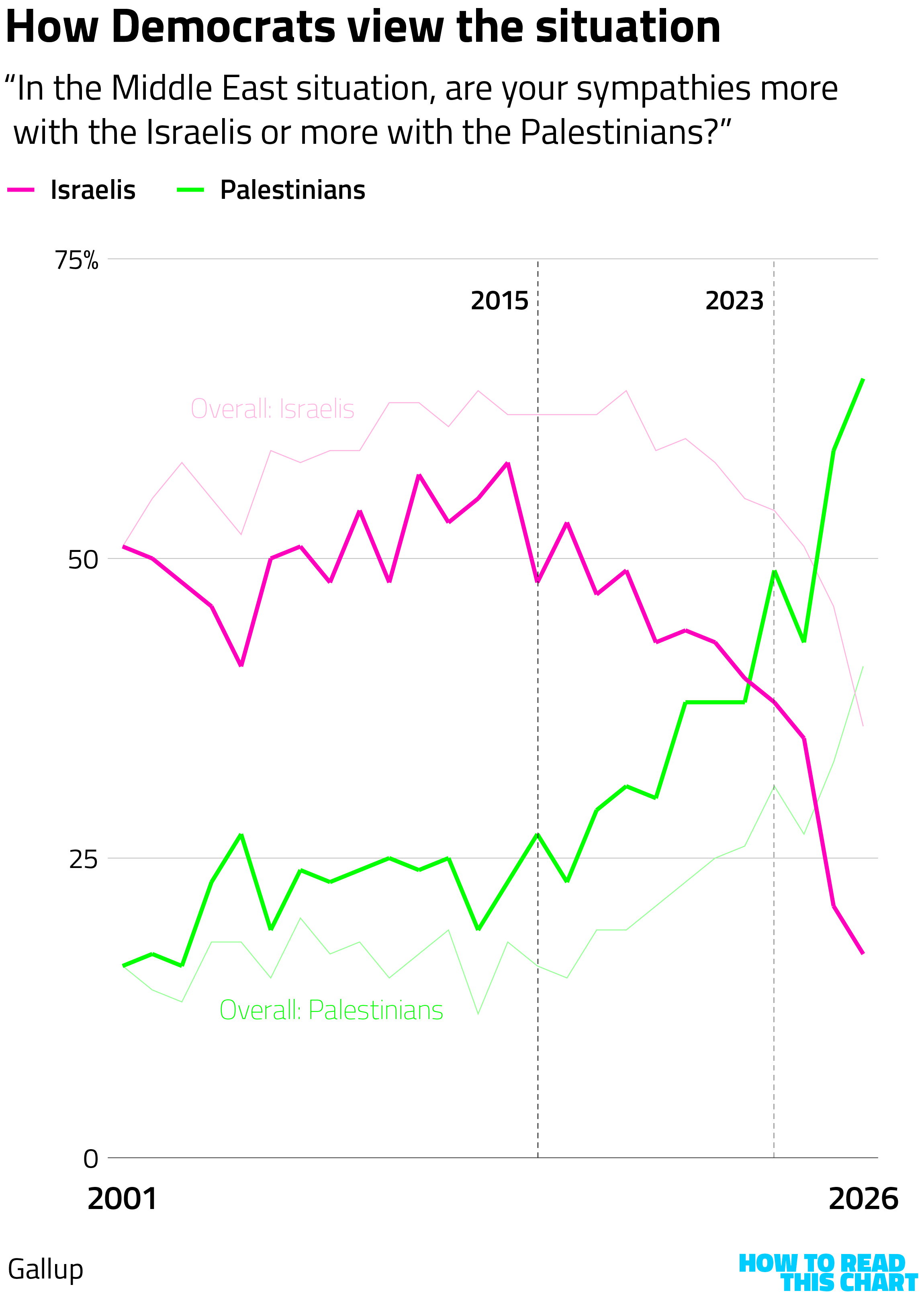 In 2015, you may recall, Netanyahu spoke before Congress (at Republicans' invitation) to criticize Obama and the deal. Democrats were not happy. The decline in Democratic sympathy for Israel picked up after that point and sympathy for Palestinians increased.