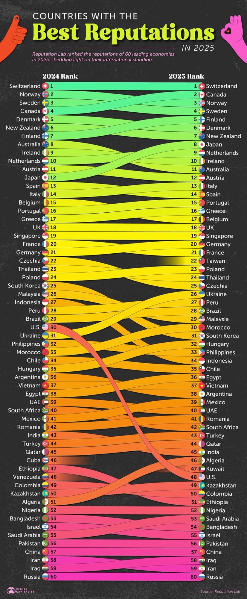 Reader Lynnette Haggerty passed along this visualization of how the global reputations of various countries changed between 2024 and 2025. See if any countries jump out at you!