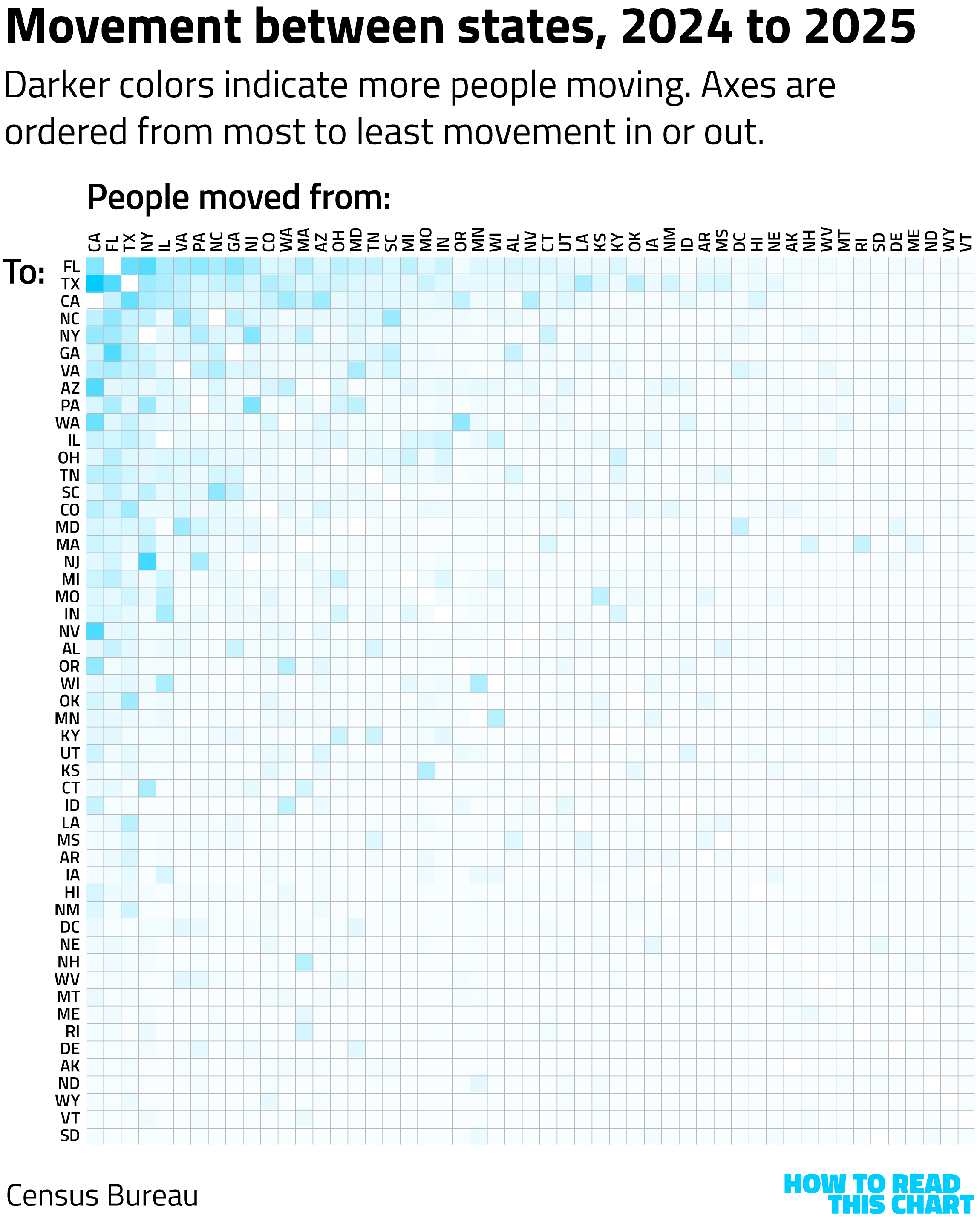 The relentlessly (and still) useful Census Bureau also released data this week showing where Americans moved between 2023 and 2024. This is immensely interesting, for those who like this sort of thing, an index of interstate movement that informs you (for example) that approximately 550 people moved from Hawaii to Alaska for inexplicable reasons.