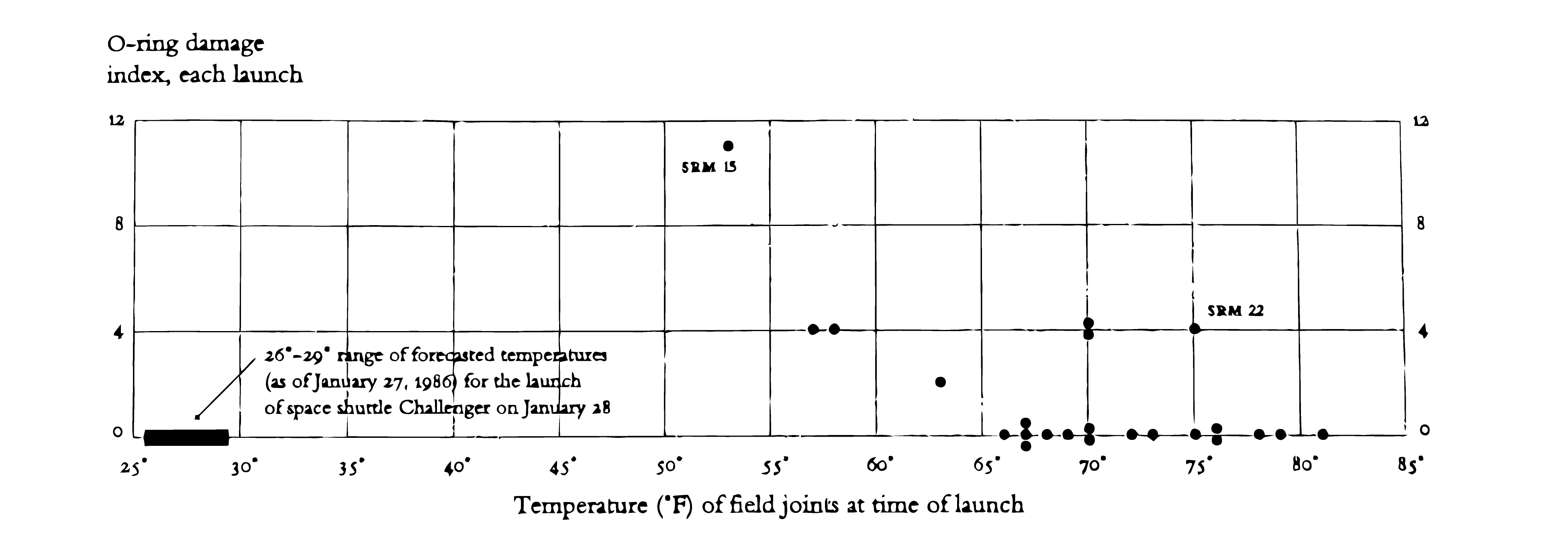 NASA had data showing that these O-rings were more likely to be damaged in colder weather, but that data was not — as designer Edward Tufte has argued — presented in a way that made this correlation clear. When that damage is plotted relative to temperature, it's easy to see why the cold weather should have triggered more alarm.