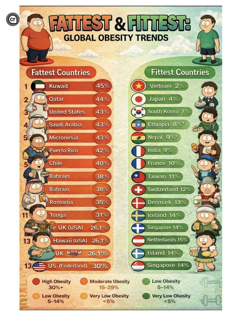 A tip of the hat to the U.K. (U.S.A.), which is trimmer than the U.K. (weird symbol) even though they have the same percentage of … something. And props to those of you who live in U.S. (Federland), who are much svelter than those of us in the United States. If only we could all be as thin as the people of Island!