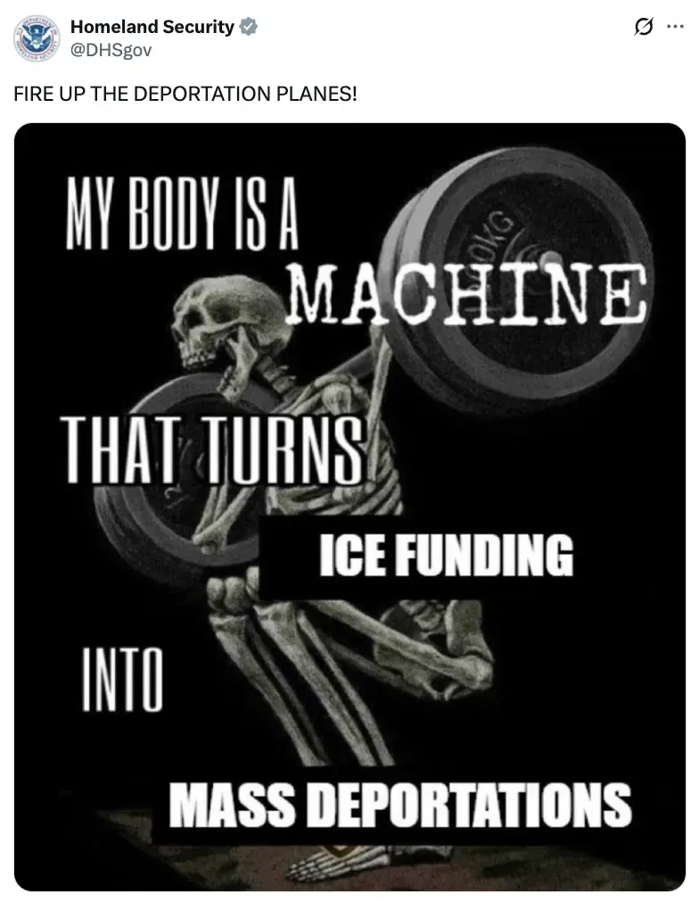 Speaking of hostility to American traditions, you might have noticed that the Department of Homeland Security's social media feeds are cluttered with weird, fascistic memes. YouGov, bless them, showed ten of them to Americans and asked whether they approved or disapproved of what they saw.