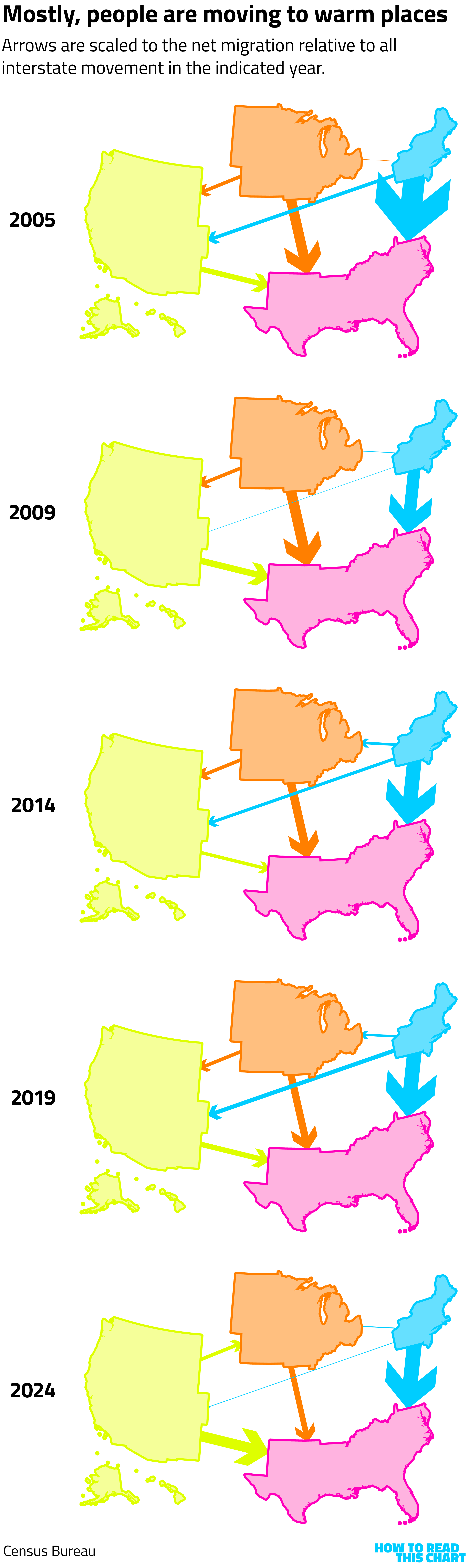 Again, though, this isn't the full picture. The actual trend has less to do with politics than it does weather. Over the past 20-odd years, people have moved from the Northeast to the South, in part because the weather is generally better.