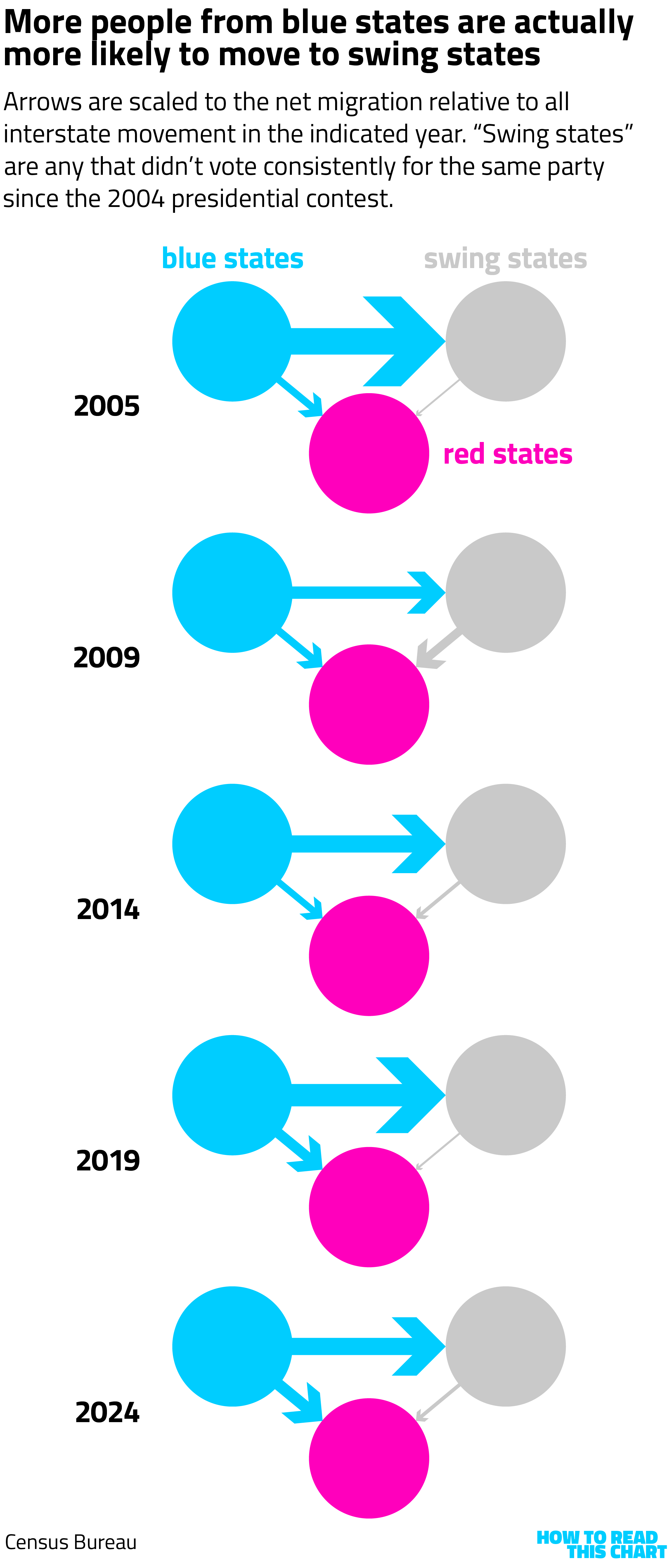 But this is using a definition of "red" and "blue" that depends on the 2024 election. If we use a more nuanced definition — looking at states that have always voted red or blue since 2004 and those that haven't — we see that blue states are sending far more people to swing states. (If you're curious, there have been 16 consistently blue states and 20 consistently red ones during that period.)