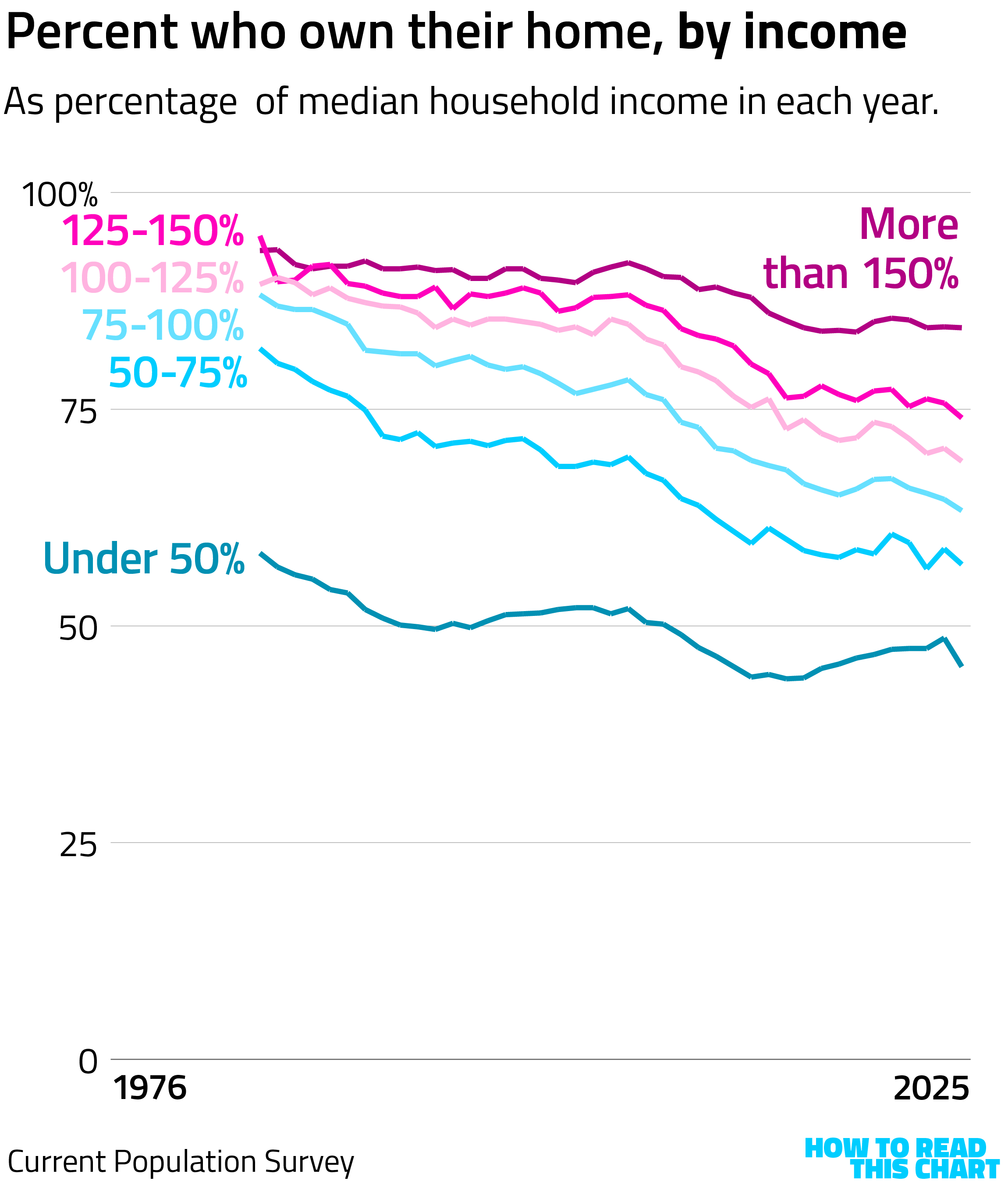 As you might have guessed, there are some differences by age. Young people are much less likely to own homes, and those aged 35 to 44 are less likely to now than they were before the recent recession. (One moment [holds earpiece] — I am being told that the Great Recession was nearly 20 years ago, which can't be right. I'll keep you posted.)