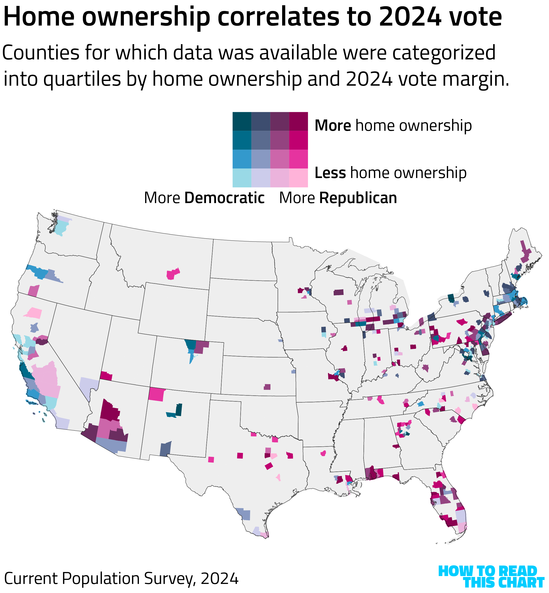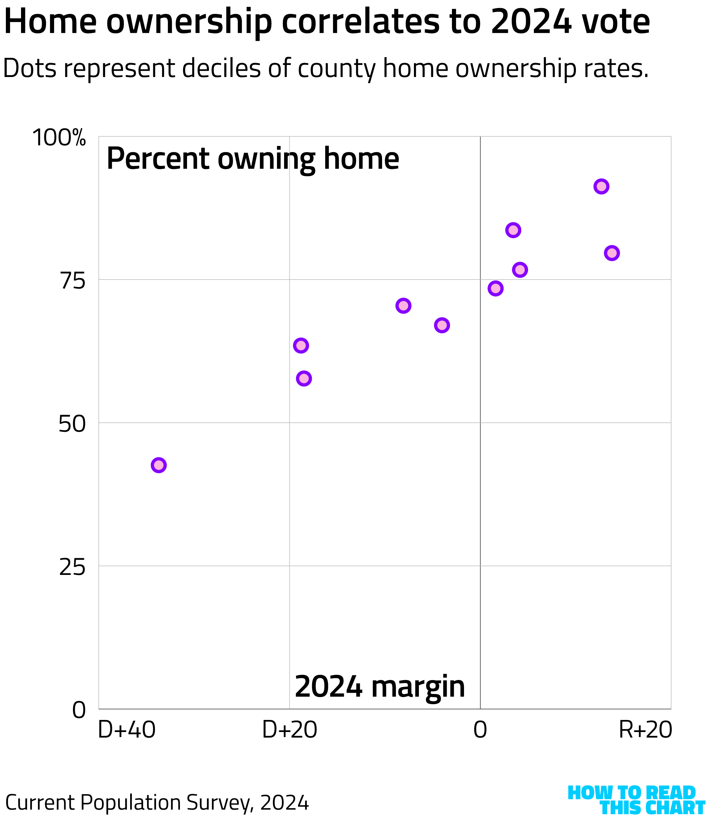 If we cluster those counties into deciles (chunks representing one-tenth of the total), we see a correlation: places with more home ownership were more likely to support Trump in 2024.