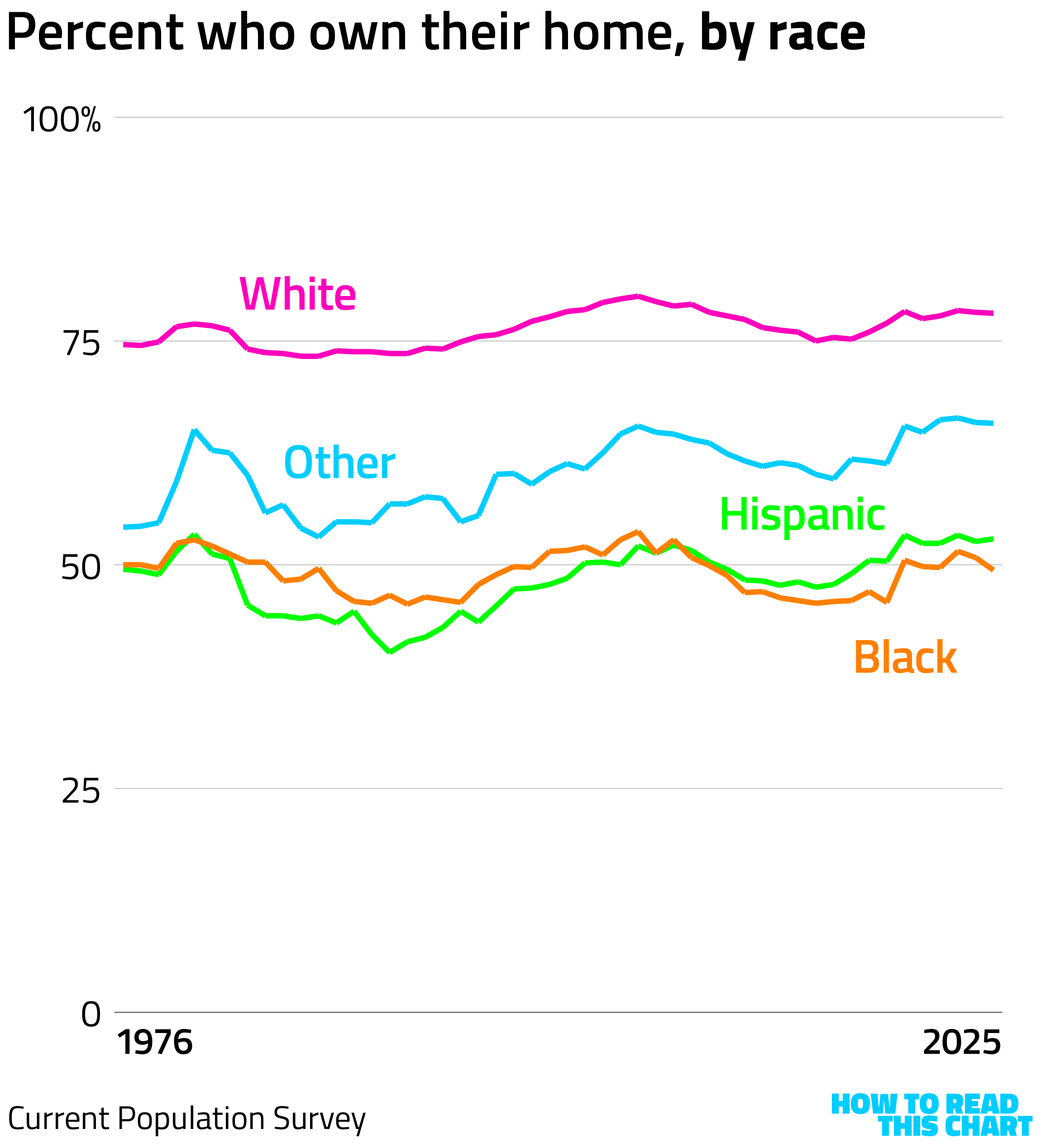 You will also probably not be surprised to learn that White Americans are more likely to own their homes than non-White Americans. (As always, my apologies to those who are clumped into the category of "other." Sample-size issues force us into uncomfortable positions.) (As Thomas Wolfe also said, probably.)