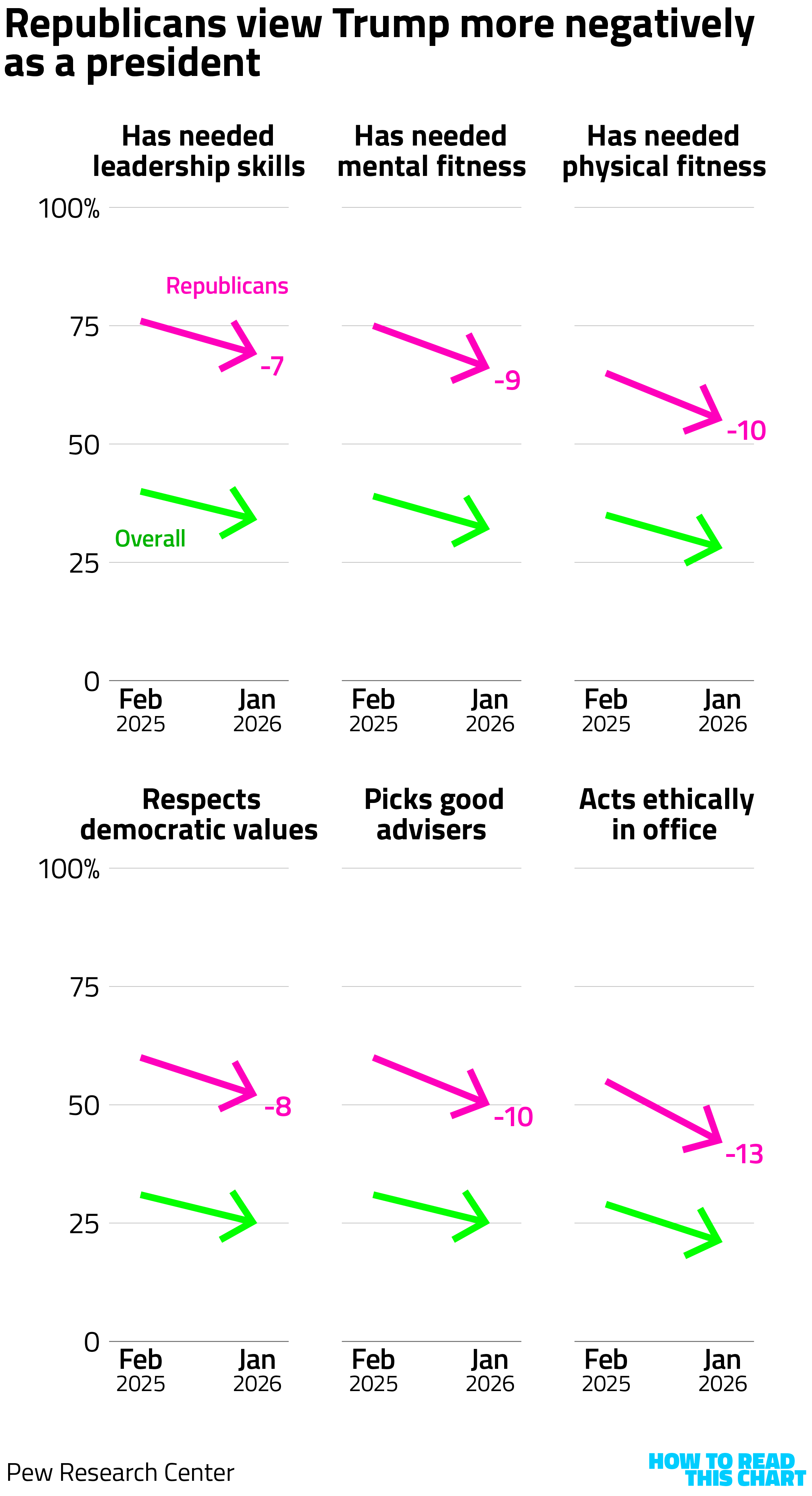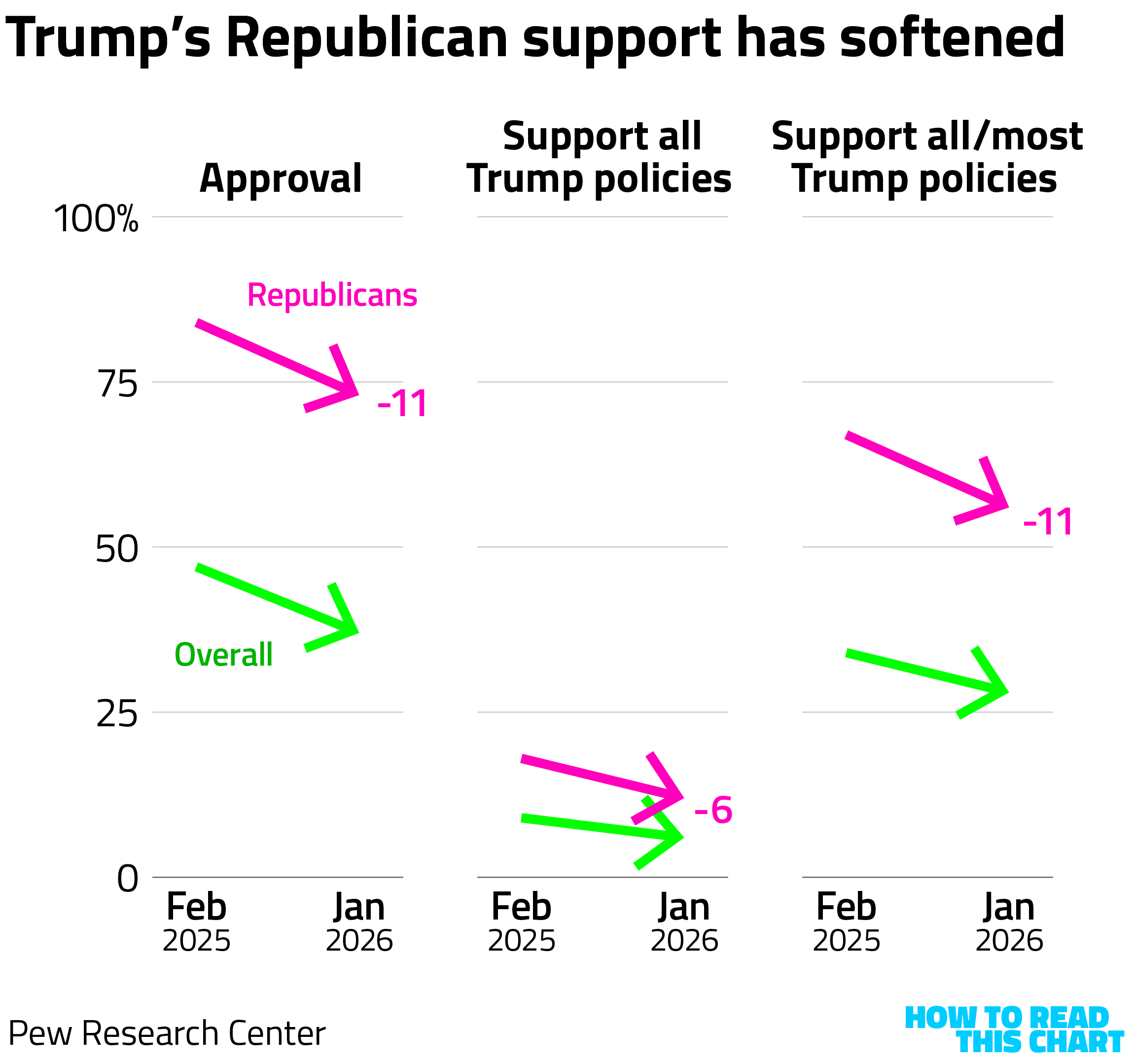 Republicans, for example, are 11 points less likely to express approval of Trump's presidency than they were last February. Most still do, but that's a big drop.