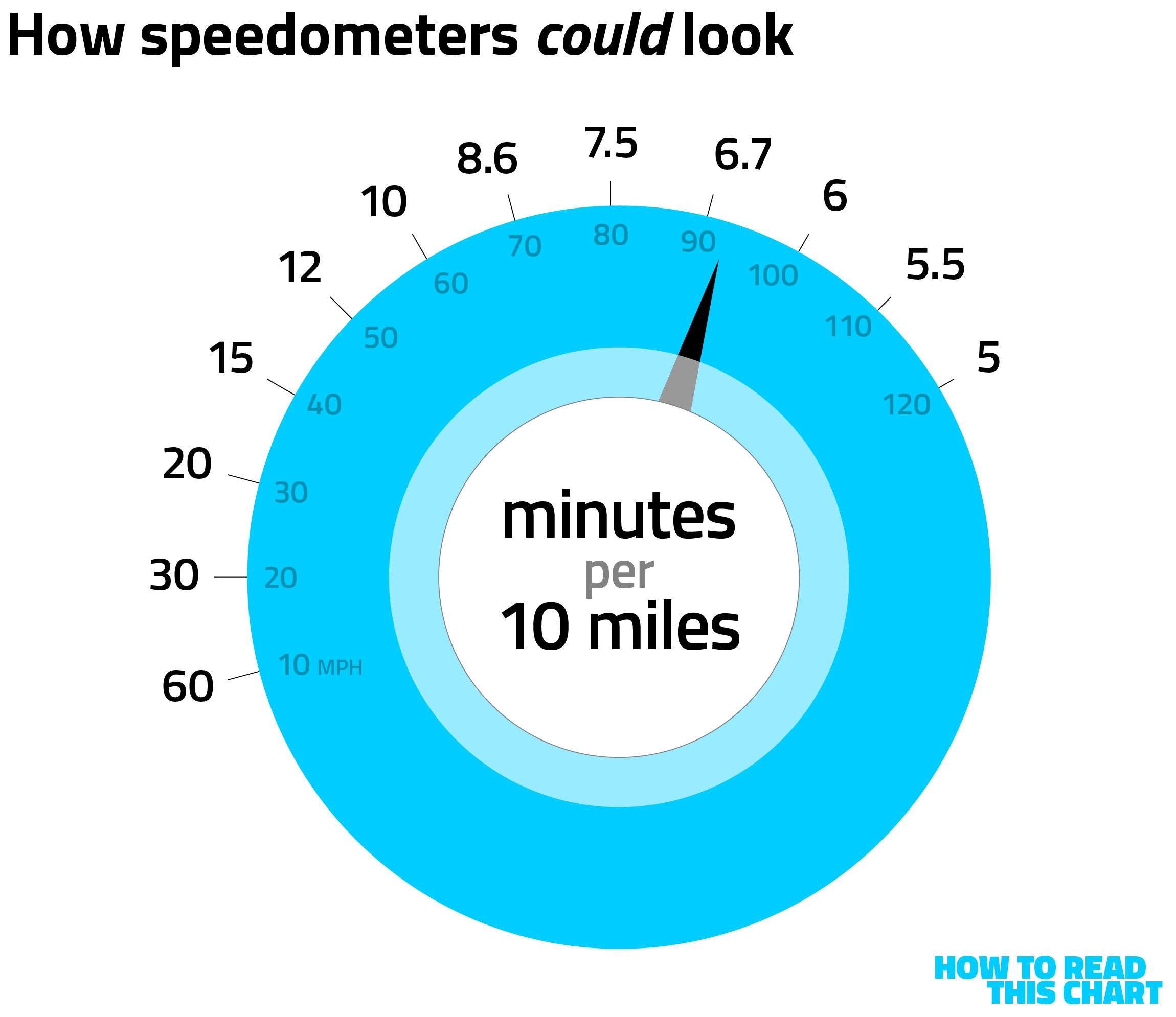 But this can suggest that increased speed means a consistently reduced time until a certain distance is covered, when that reduction isn't consistent at all. Sutherland proposes an alternative speedometer, showing how long it will take to drive 10 miles at a given speed.