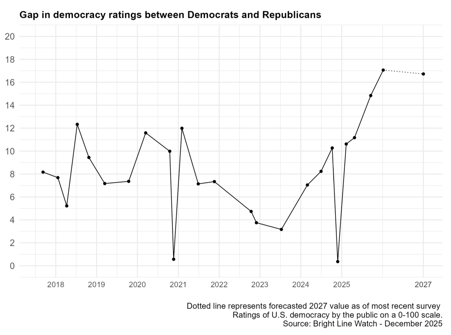We aren't quite done with visualizations of the changes that the country has undergone over the past 15 months. A new report from Bright Line Watch, for example, shows ongoing concern about American democracy — including the sharp gap in that concern by party.