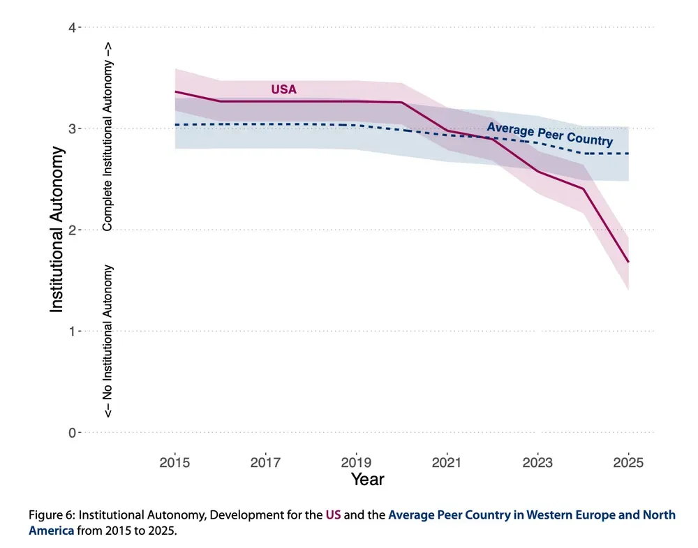 An annual measure of academic freedom, meanwhile, shows how that metric has collapsed in the U.S. in recent years.