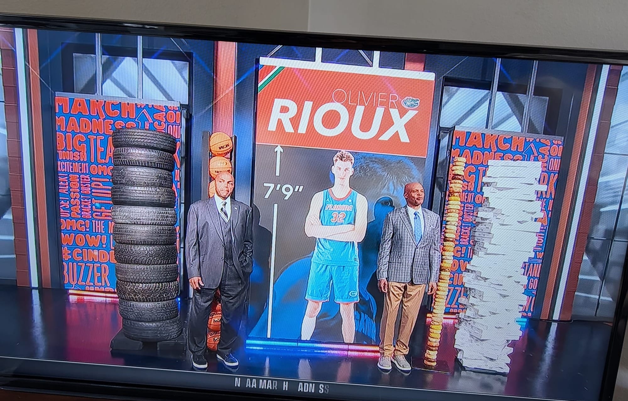 But now we will set aside even the most tangential efforts to comport with our theme in order to consider this graphic sent by reader Jim Beaver, plucked from a March Madness television broadcast. It attempts to put the exceptional height of Florida's Olivier Rioux in appreciable context.