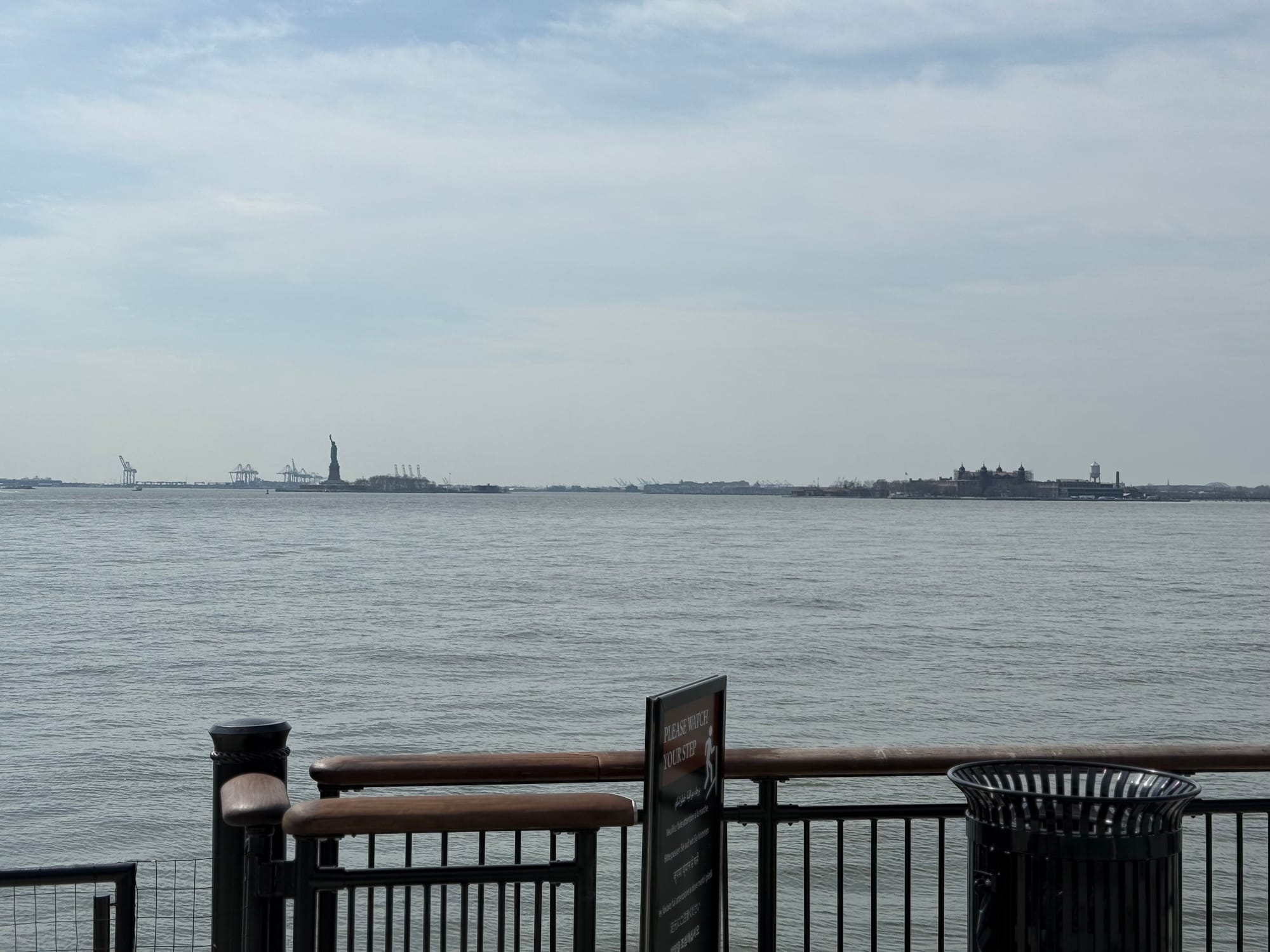 And then finally, just after 2 p.m., I arrived at my destination. I looked out past the sea of tourists and over a forest of barricades to see New York Harbor and its two monuments to American immigration: the Statue of Liberty (at left) and Ellis Island (at right). This had been my destination, but only after it had been a destination for so many others back over the past few centuries.