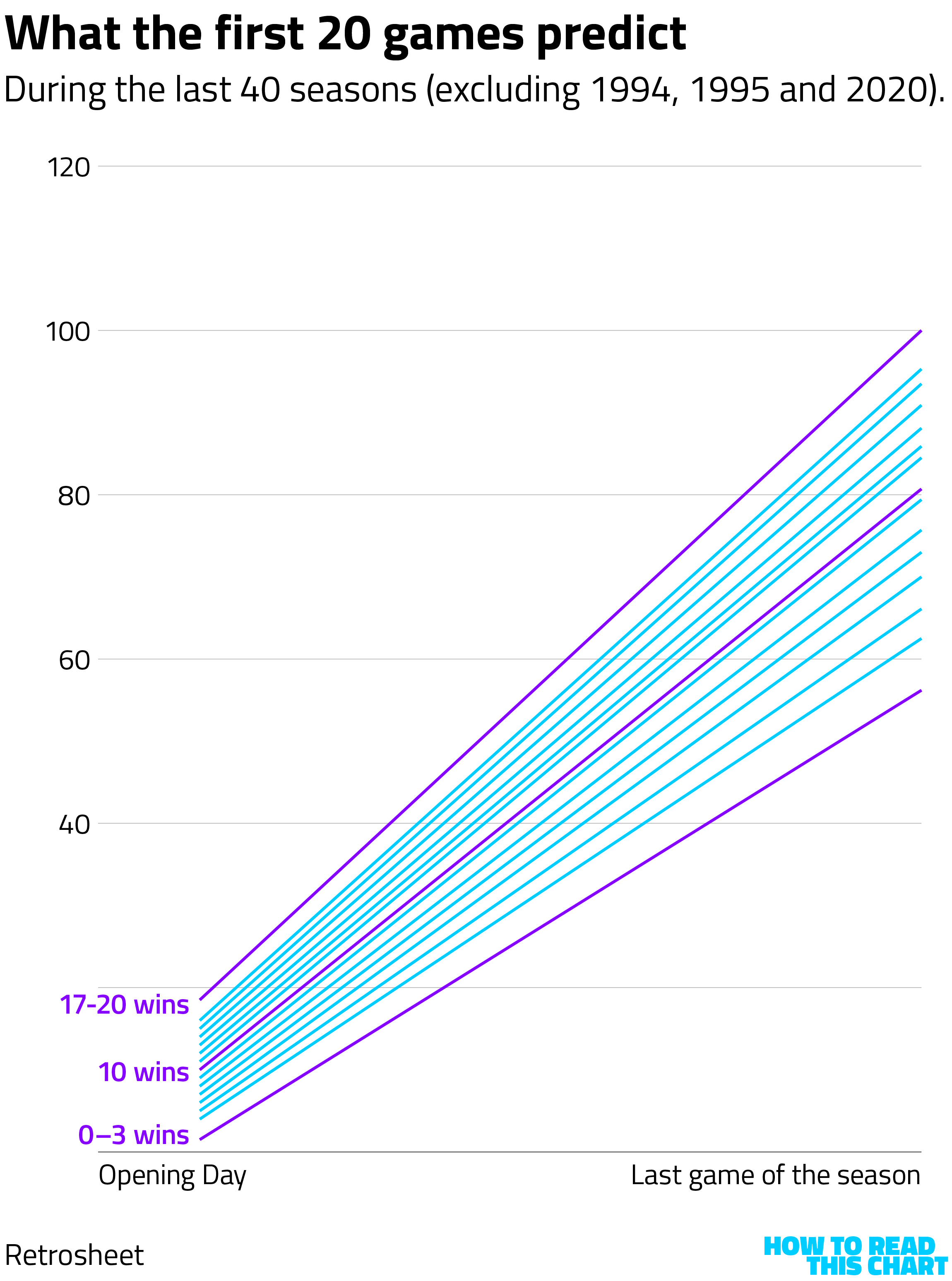So I decided to dig a little deeper. If an Opening-Day win was a coin toss as a predictor, how about the first 20 of a season's 162 games? As you might expect, this was a much clearer guide, with teams that won 10 of their first 20 games ending up with winning seasons just over half the time in the past 40 seasons. (The chart below shows the average number of wins in a season for teams that started with zero to 20 wins in their first 20 games.)