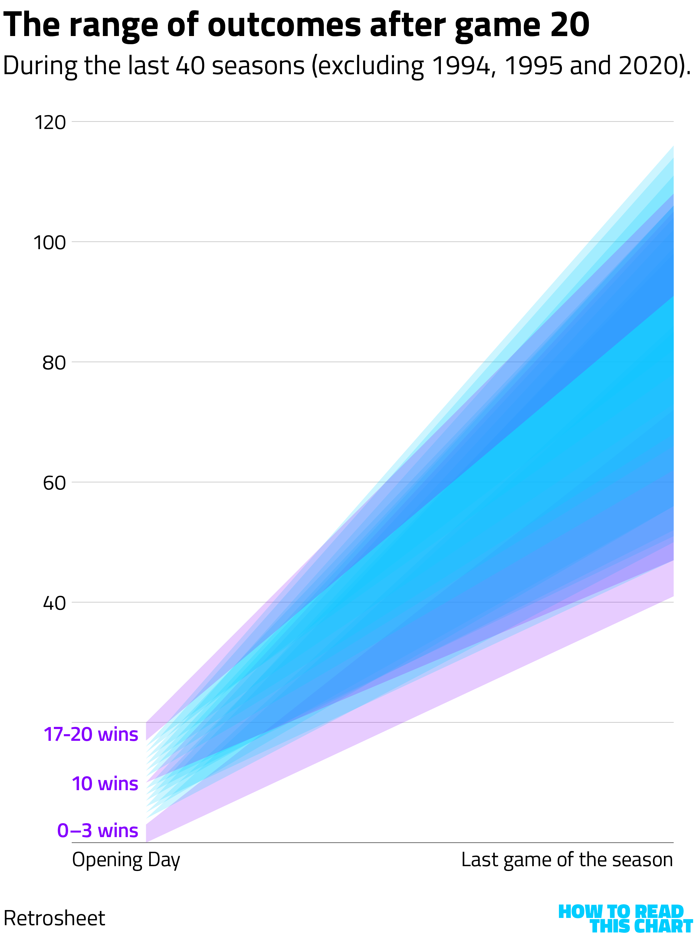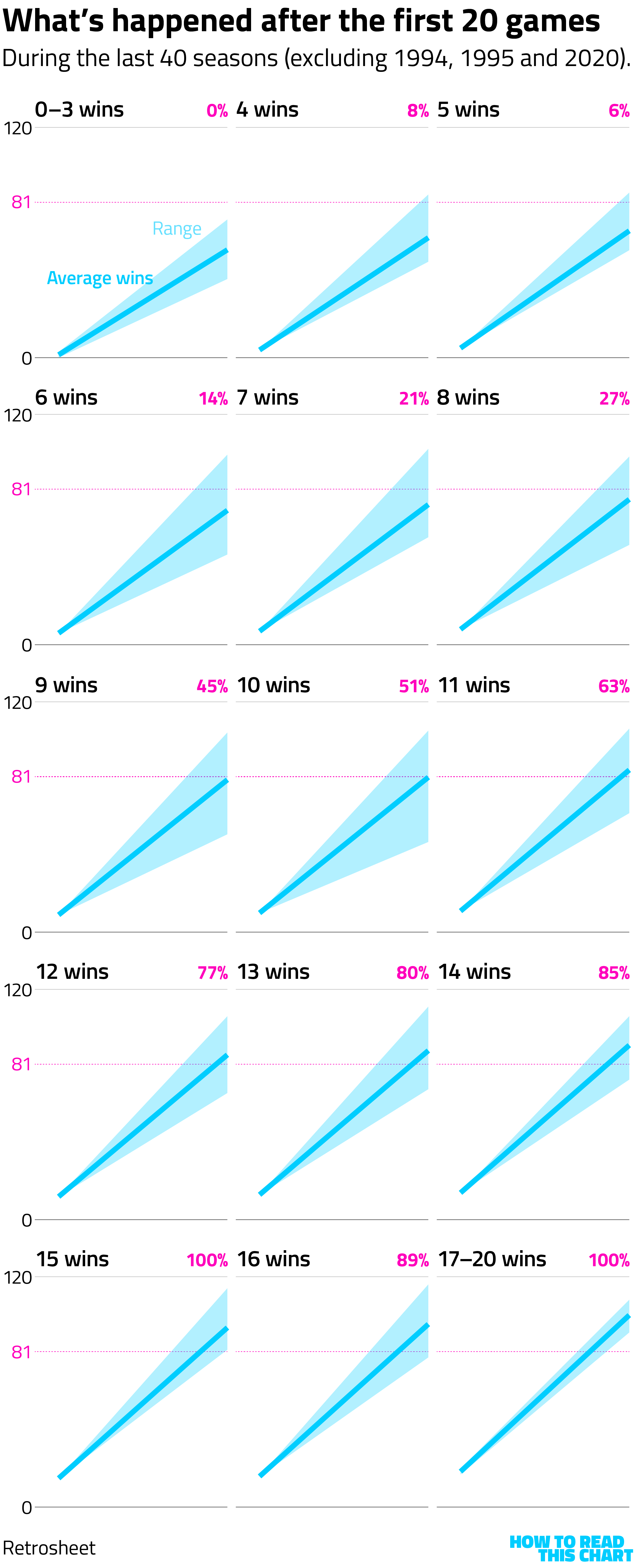 Teams that won 17 or more of their first 20 always had winning seasons in that period; teams that won three or fewer never did. But what about everyone else?