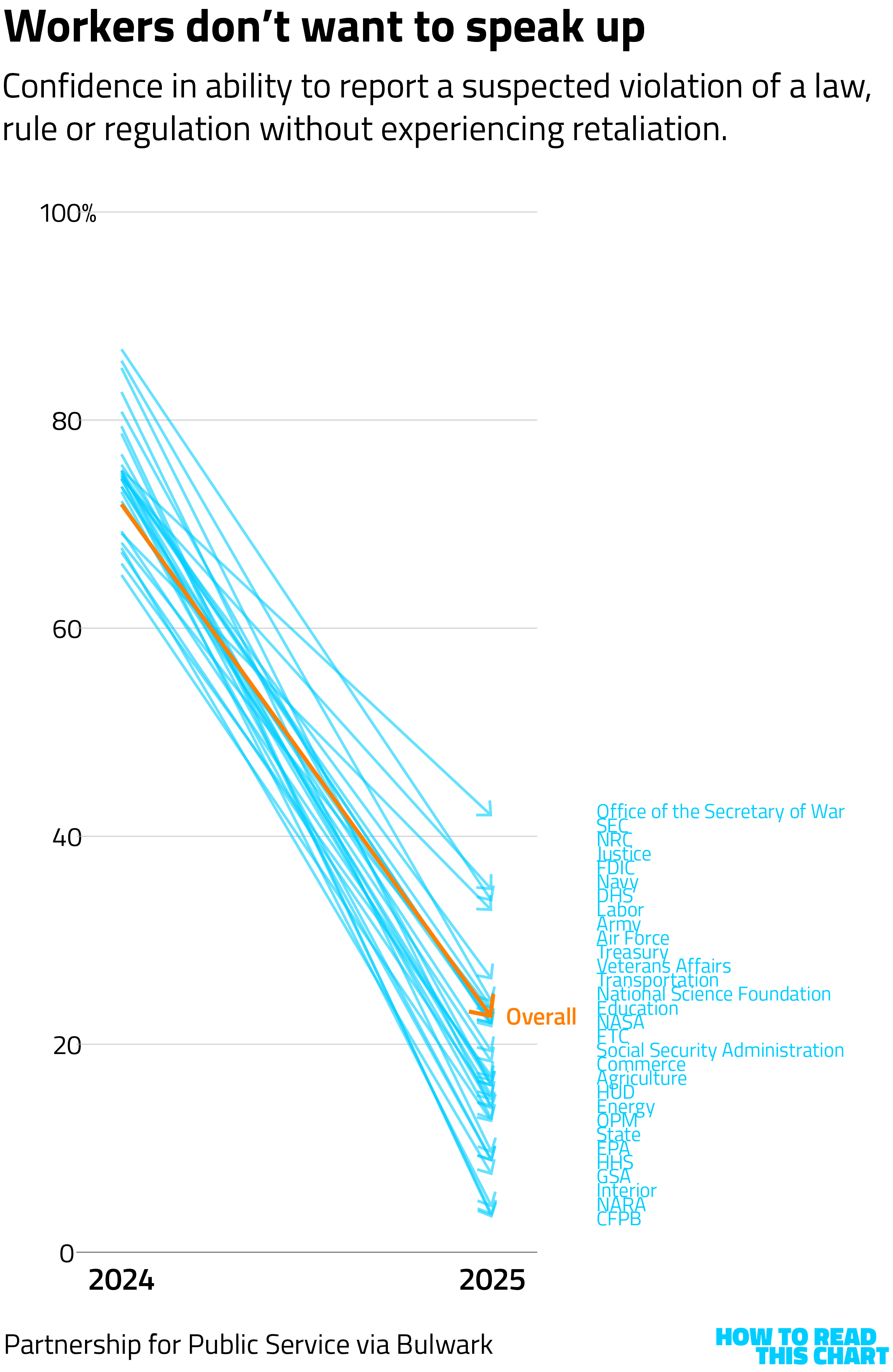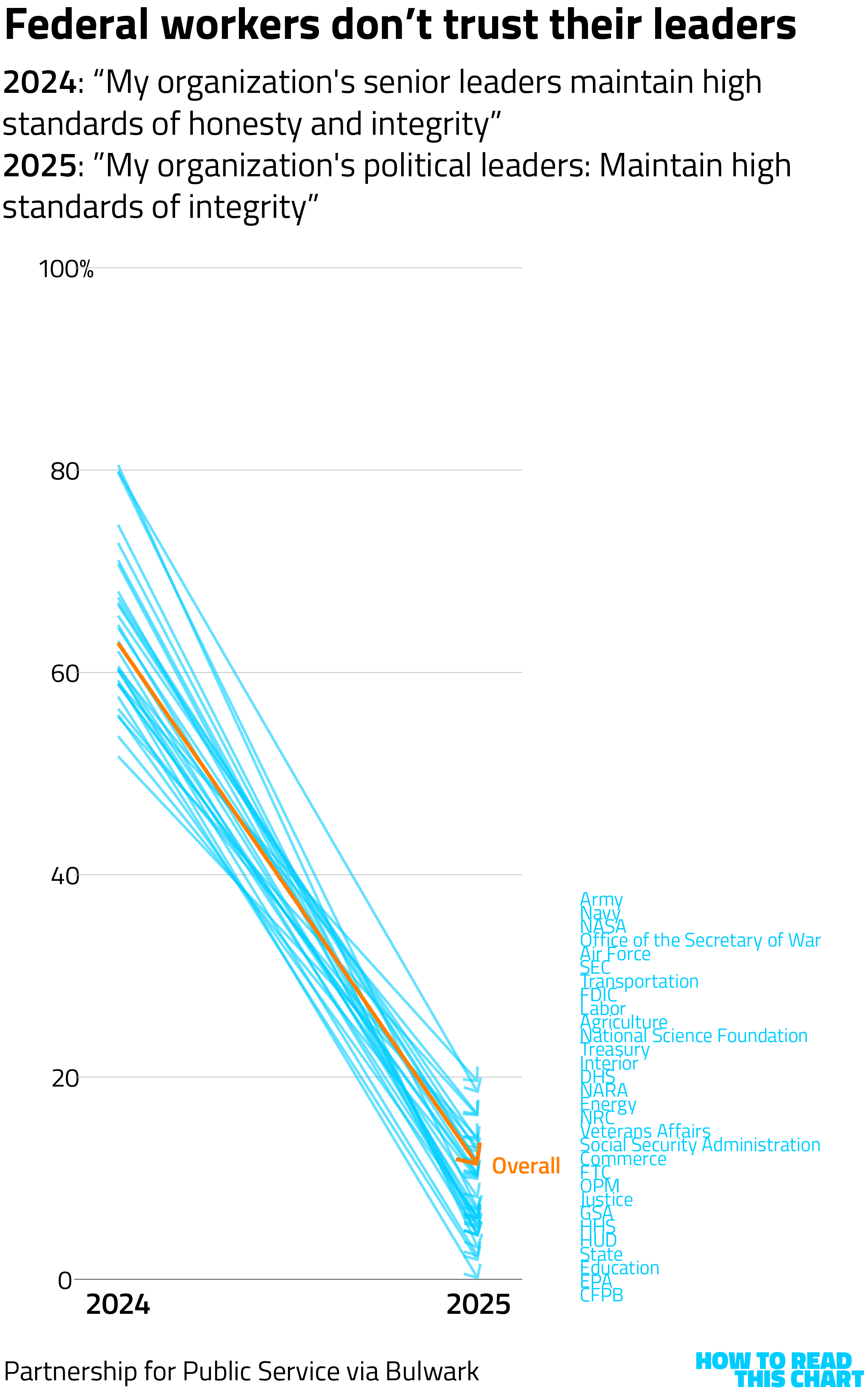 The findings were striking. As Catherine Rampell at The Bulwark reports, confidence that federal leadership acts with honesty and integrity plunged from 2024 to 2025, across government agencies. (I've listed the agencies in order on the chart below, but the point is that all of the arrows point very sharply downward.)