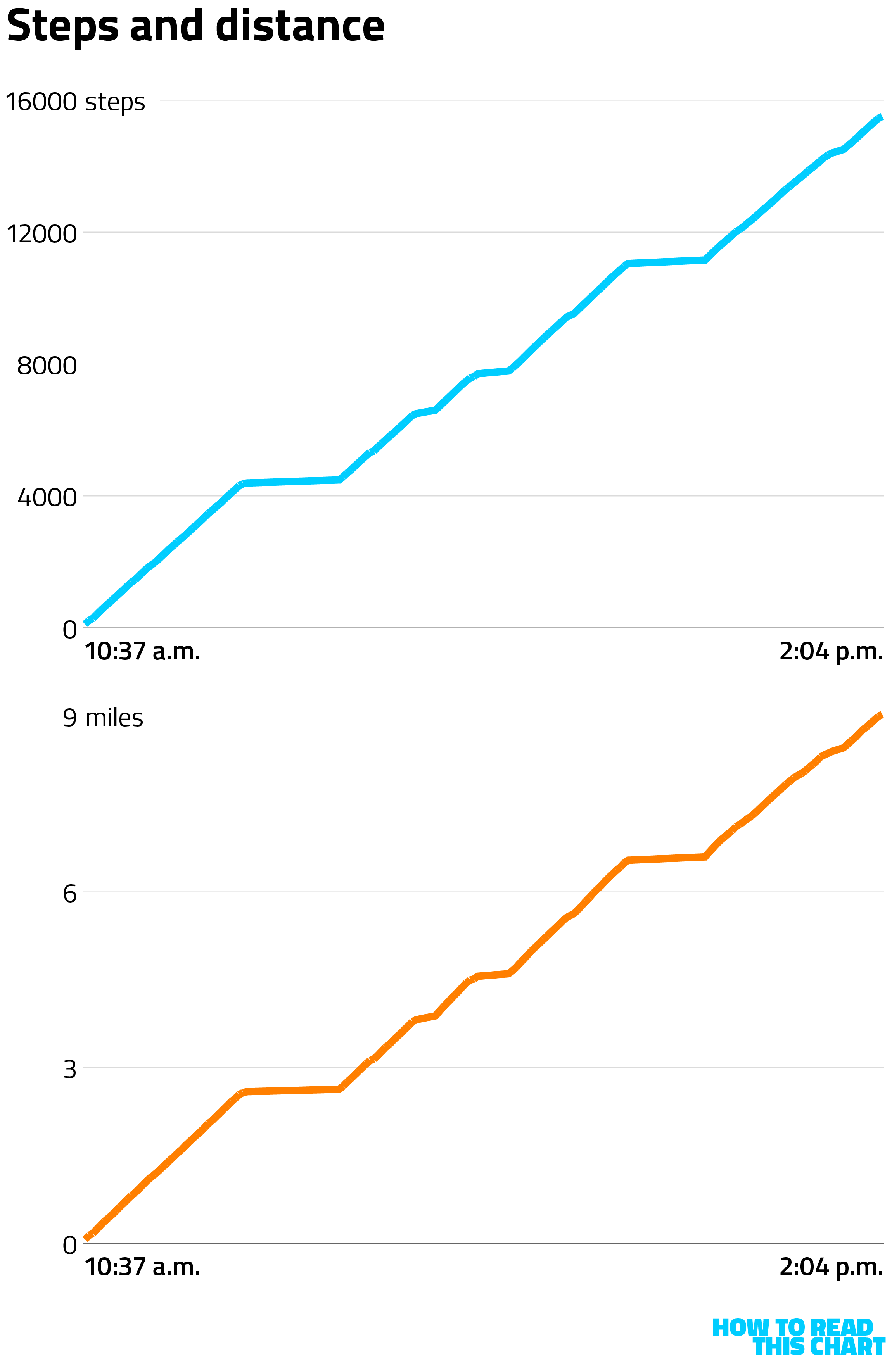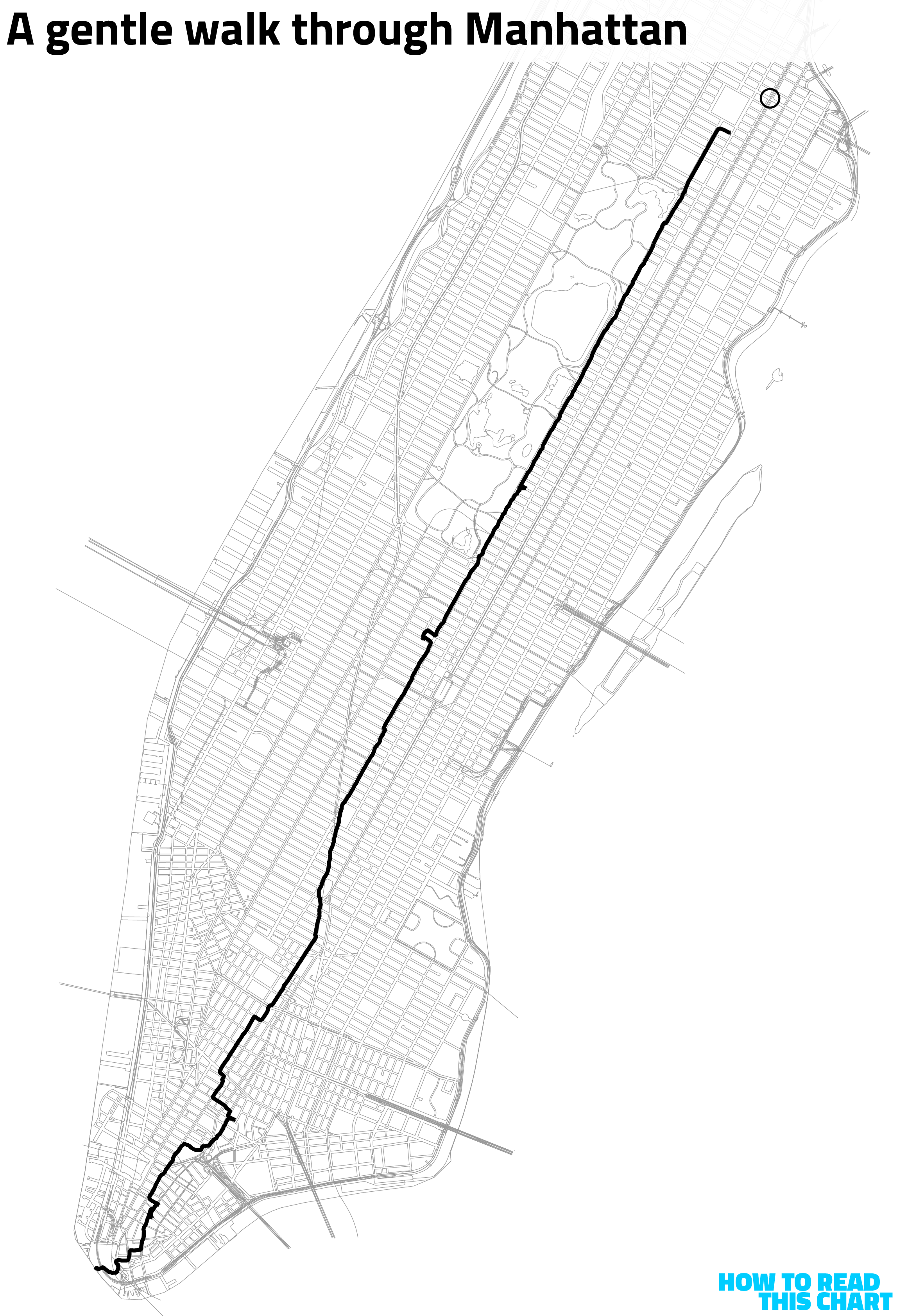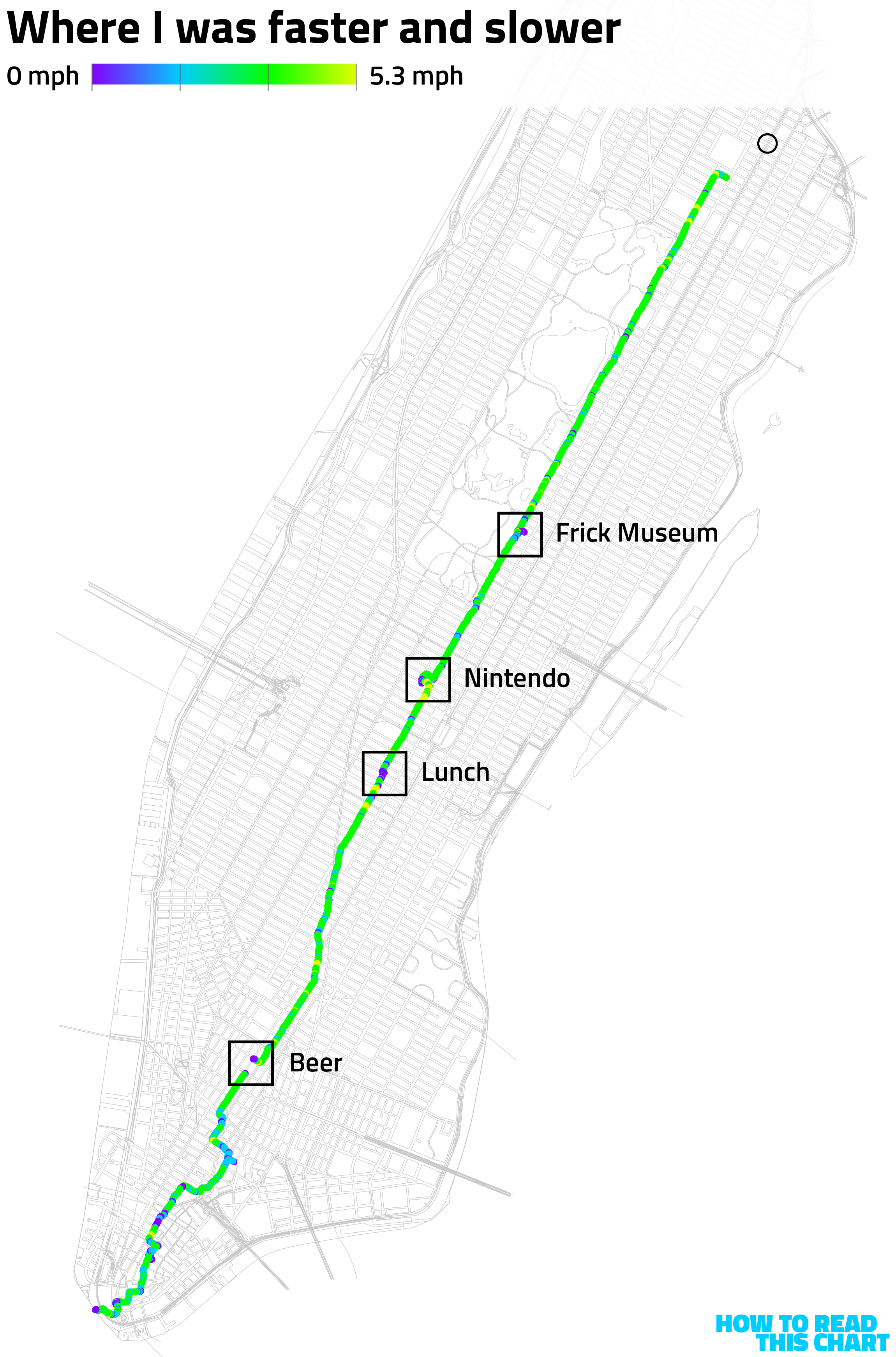 So I know, for example, that my route from Harlem to the Battery involved my taking about 16,000 steps. In total, I traveled just over nine miles over the course of about three-and-a-half hours, including those little spurs and detours but excluding the destinations to which those detours brought me.