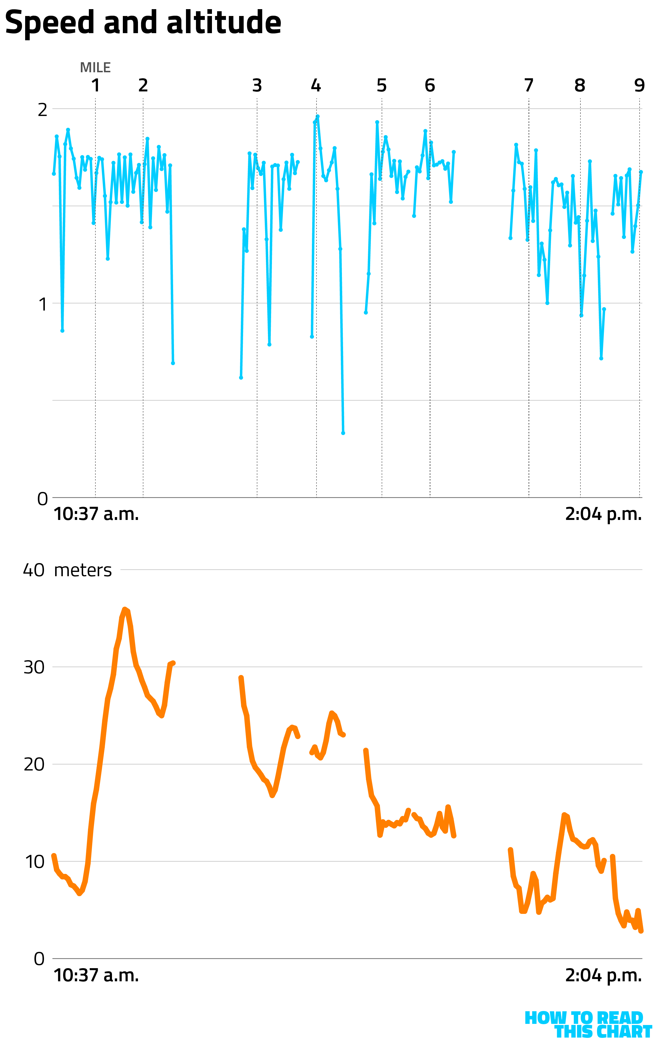 You'll notice that there's a lot more purple and blue at the southern end of the island. That's because, seven, eight, nine miles in, I got a little tired. You can see how I slowed down on the graph below (showing speed in meters per second). You can also see that this slowdown occurred even though I was mostly still heading downhill.