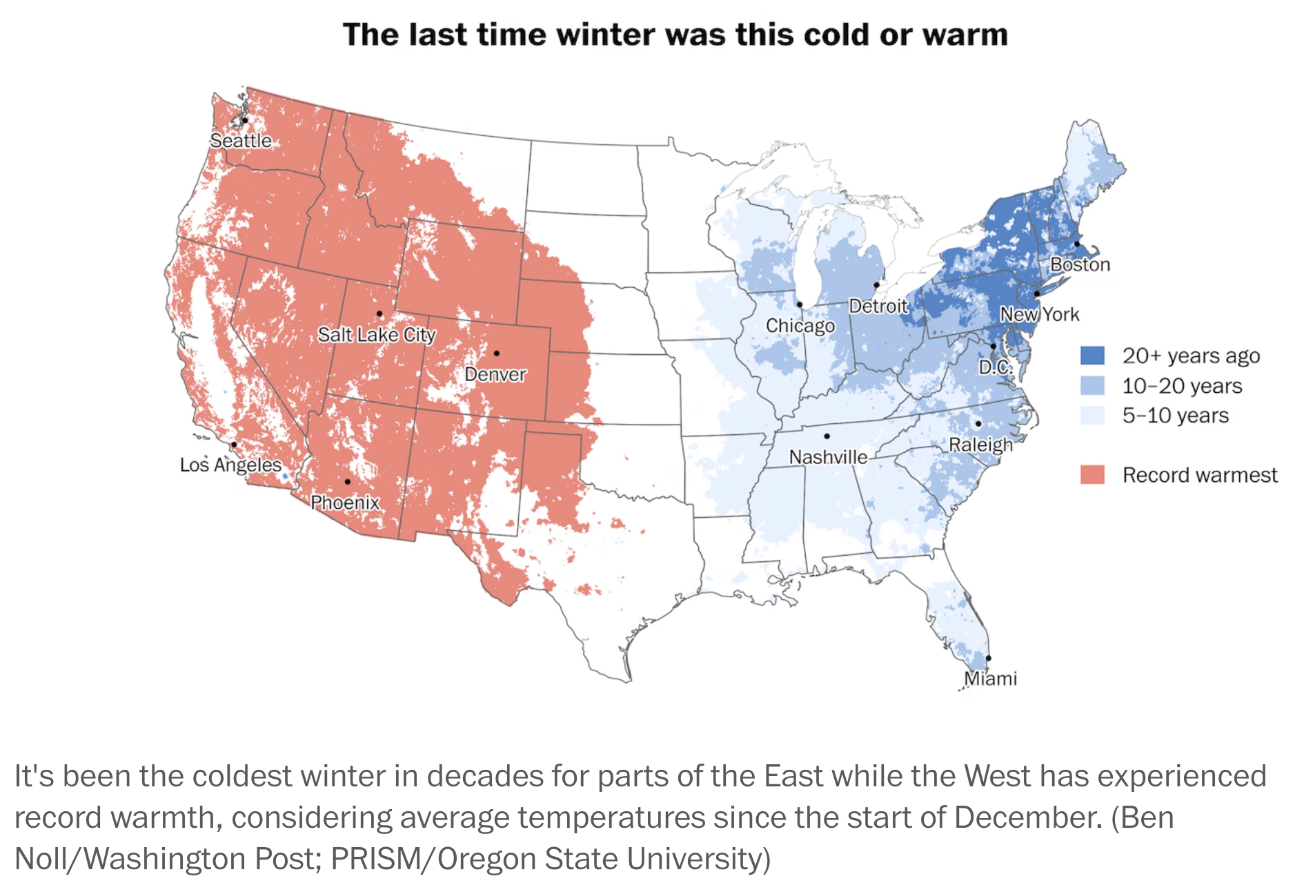 In another follow-up to the D.C. weather chapter from this newsletter, The Post also created this terrific map of the winter's abnormal weather. On the East Coast, it was far colder than normal; in the West, far warmer.