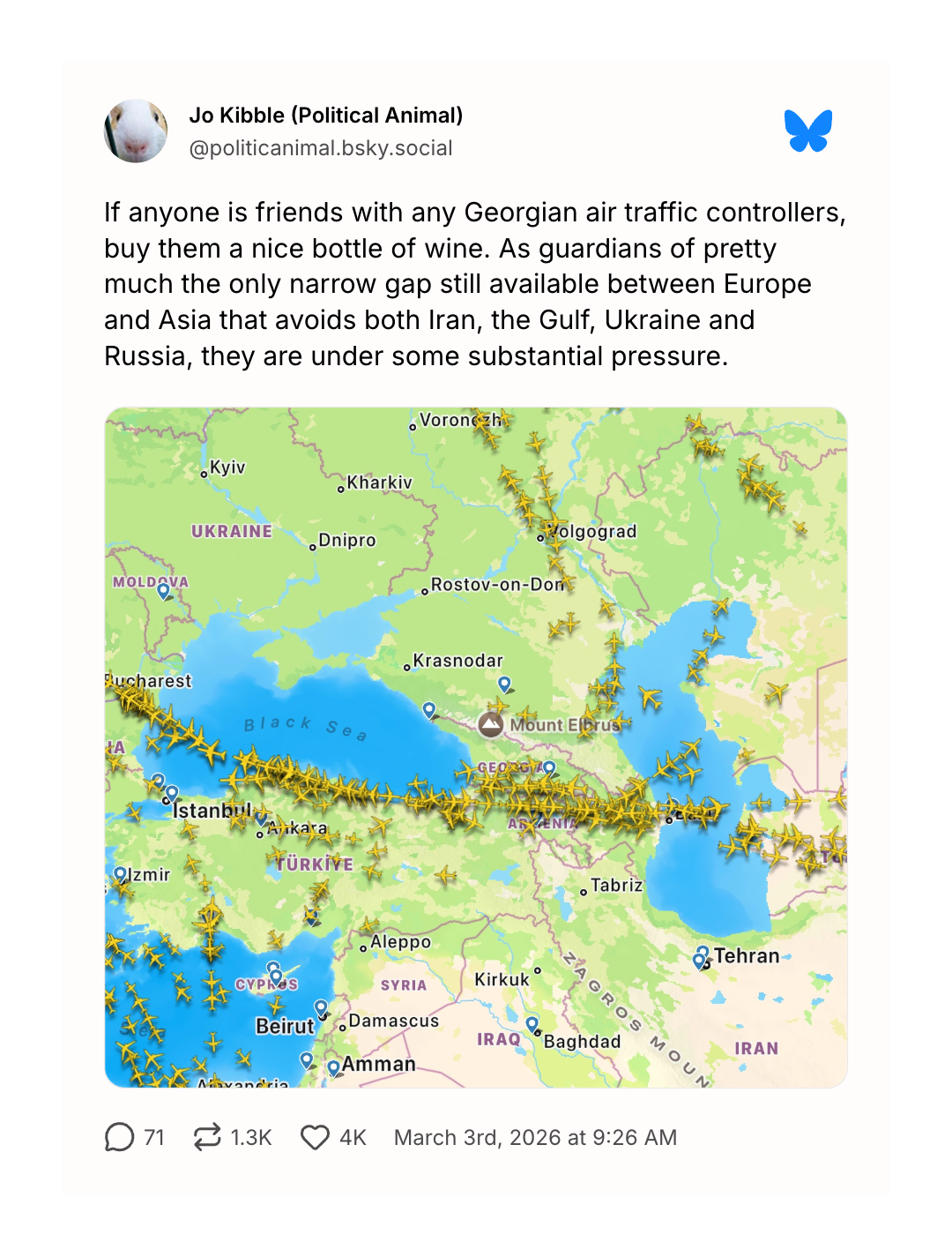 The Don't-Call-It-A-War in Iran is now one week old, meaning that we are starting to get useful data visualizations about the effects of the conflict. On the map below, we can see the effects of two conflicts: airplanes squeezed into the relatively safe channel between Iran and Ukraine as they head from Europe to Asia and back.