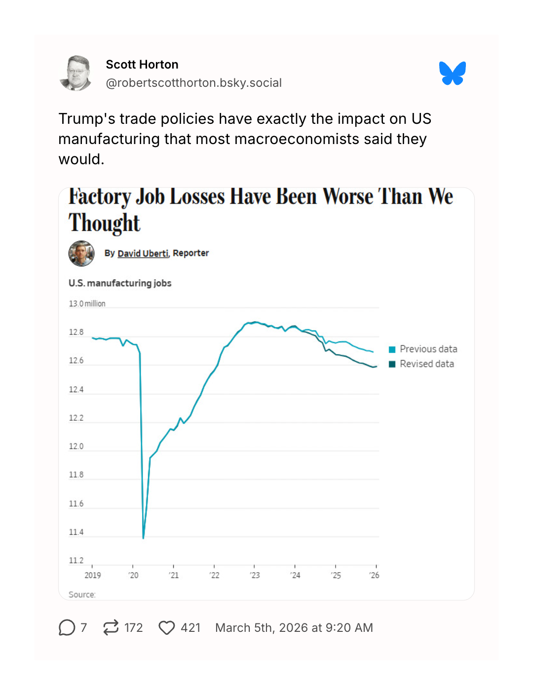 At the beginning of every year, the government revises the prior year's employment data to reflect population changes. The most recent revision revealed that Trump's promised manufacturing revival was even more of an un-revival than previously understood.