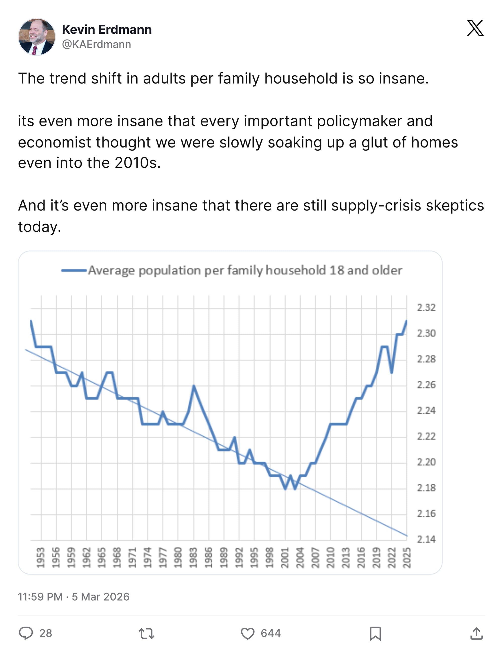 Writer Kevin Erdmann created a useful graph showing the increase in adults living with other adults (often their parents). Perhaps investing $2.8 billion (in 2026 dollars) might shift that trajectory? Just spitballing here.