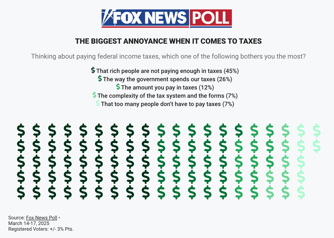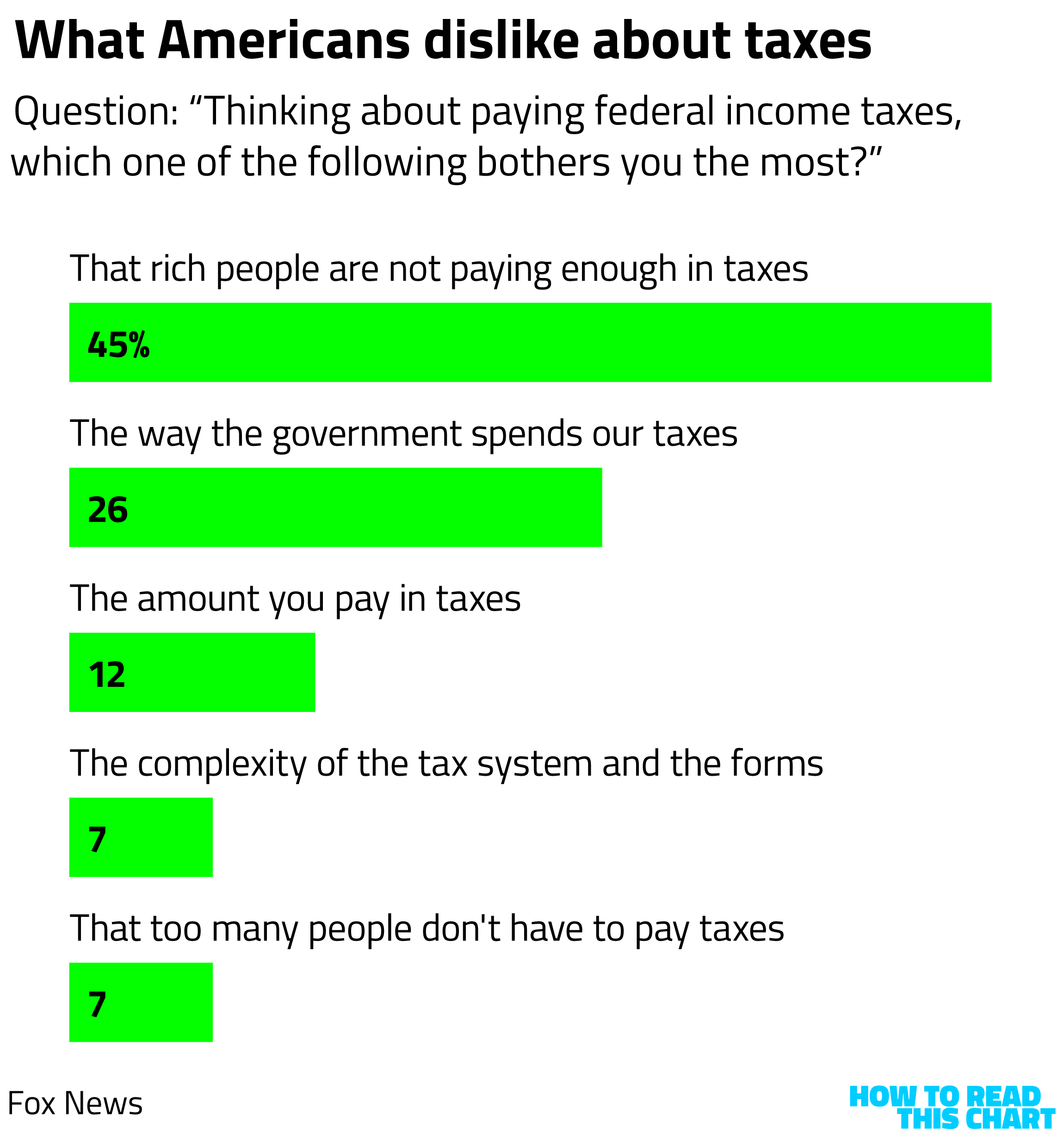 The chart below falls into that latter category. Created as part of a news article conveying the results of a new poll from Fox News, it delineates the frustrations people have with the system of taxation in the U.S. For some reason, though, the designer chose to illustrate those results with five slightly different shades of green, conveying less that there are differences in peoples' views than that you can make a pretty gradient of dollar signs if you want to.