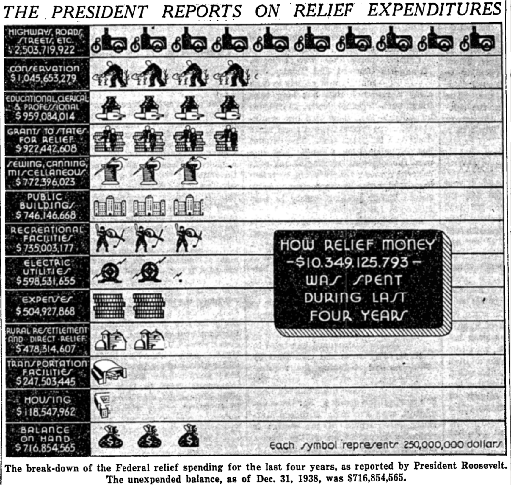 As I was perusing that 1939 issue of the New York Times, I also came across this chart of federal spending during the Roosevelt administration. Again, I am deeply enamored of the lettering and iconography. The $118 million in housing funding — $2.8 billion in 2026 dollars — isn't too shabby either.