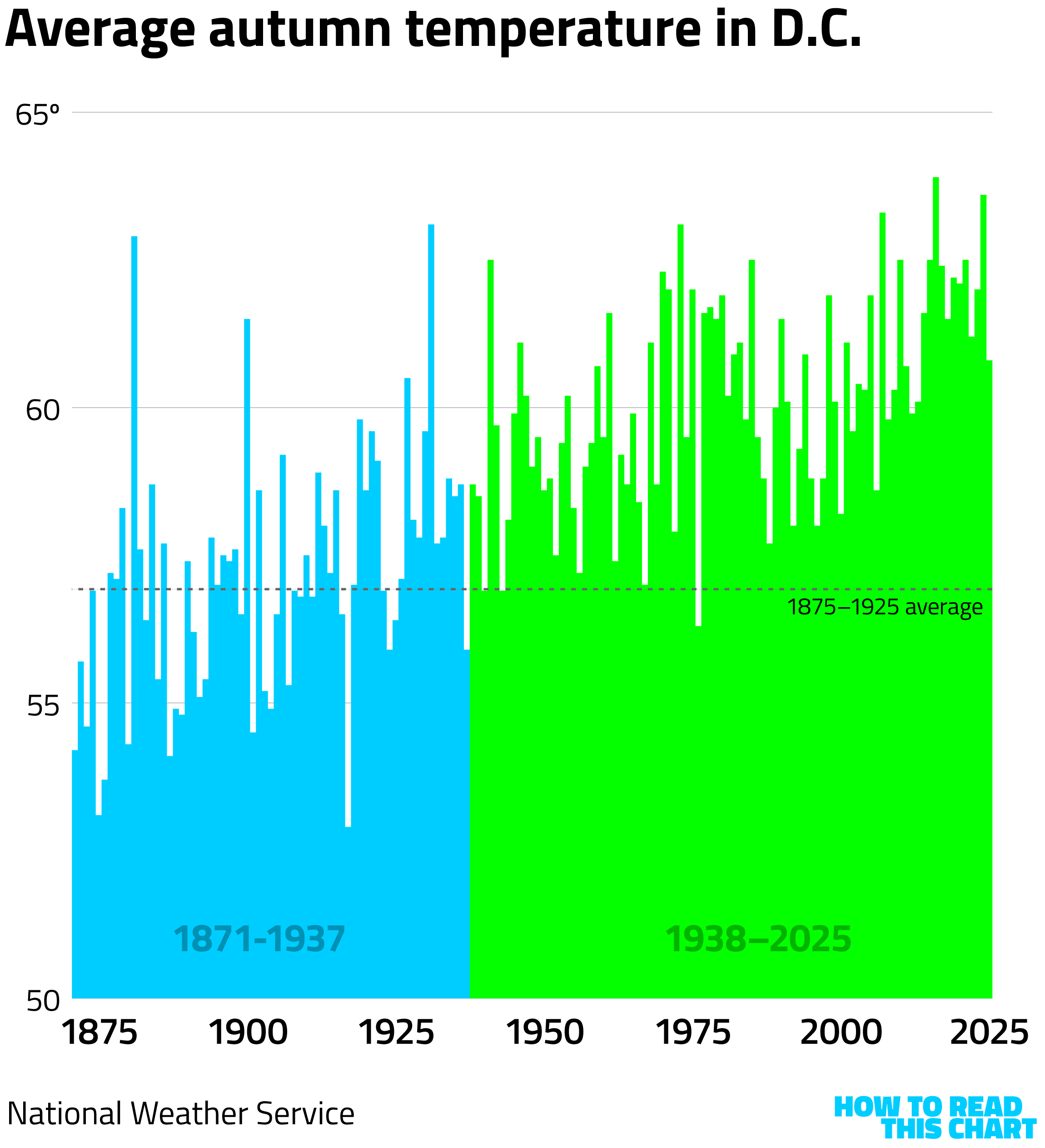Since then, there have been only three years during which D.C.'s average autumn temperature was below the average from 1875 to 1925. 2025 was the coldest autumn in more than a decade — and it was still more than three degrees above the 1875-1925 average.
