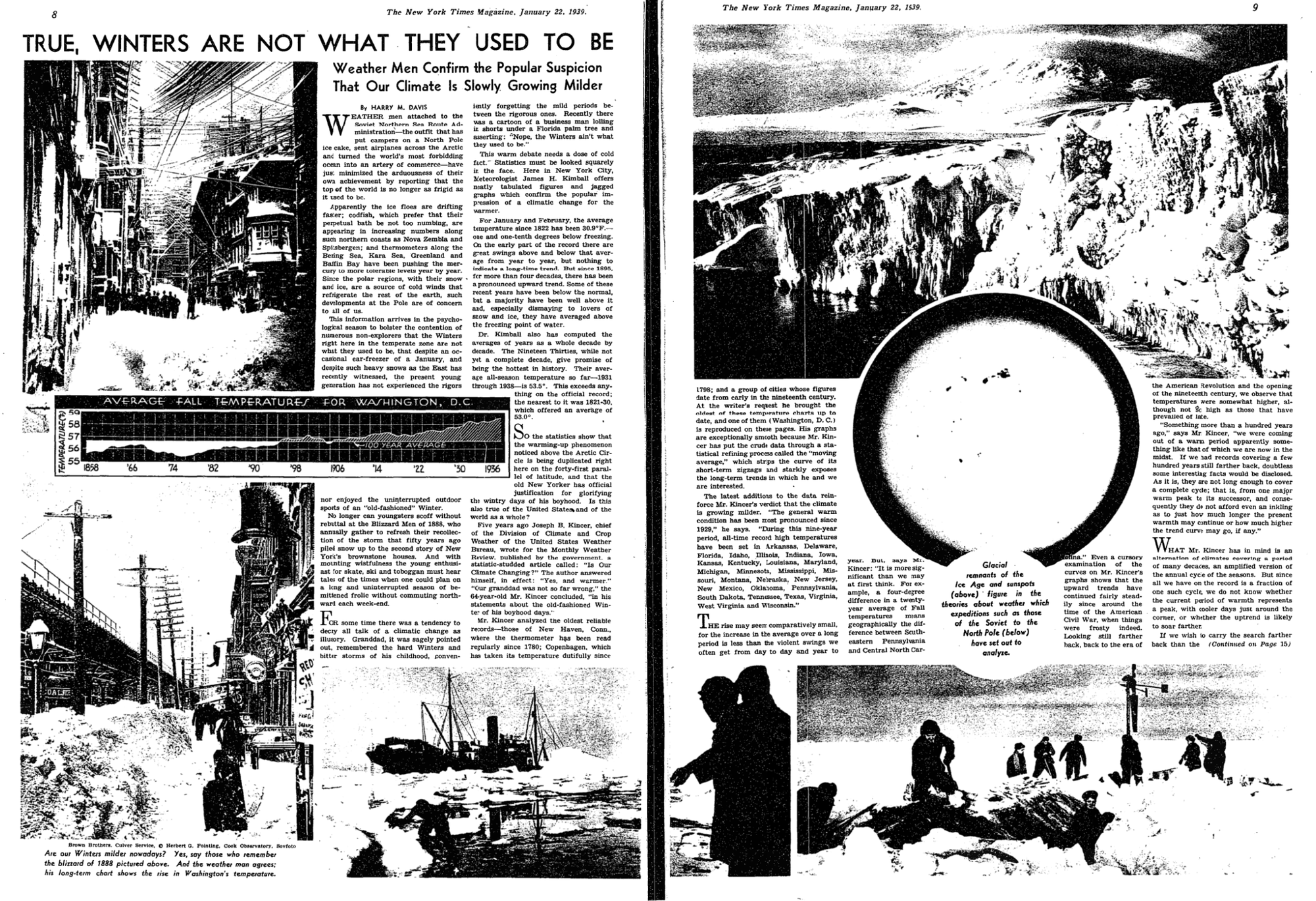 This abnormal normal is itself not new. Meandering through the New York Times archives this week, I found a story from a 1939 issue of the Times Magazine, musing about the increasing warmth of Northeastern winters. They were a bit off on the cause (proposing, for example, sunspot activity), but nailed the trend.