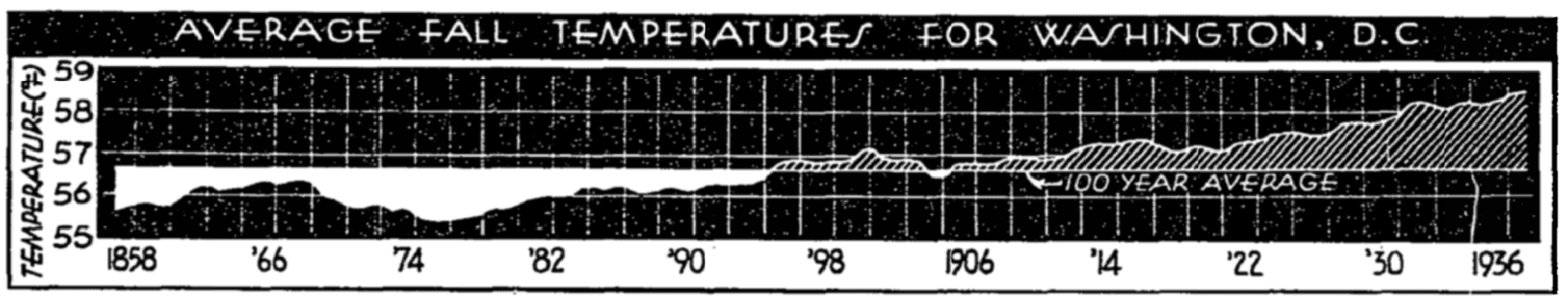 You can see that on the chart included in the article. Autumn temperatures in the nation's capital had risen from the mid- to upper-50s over the course of the prior eight decades.