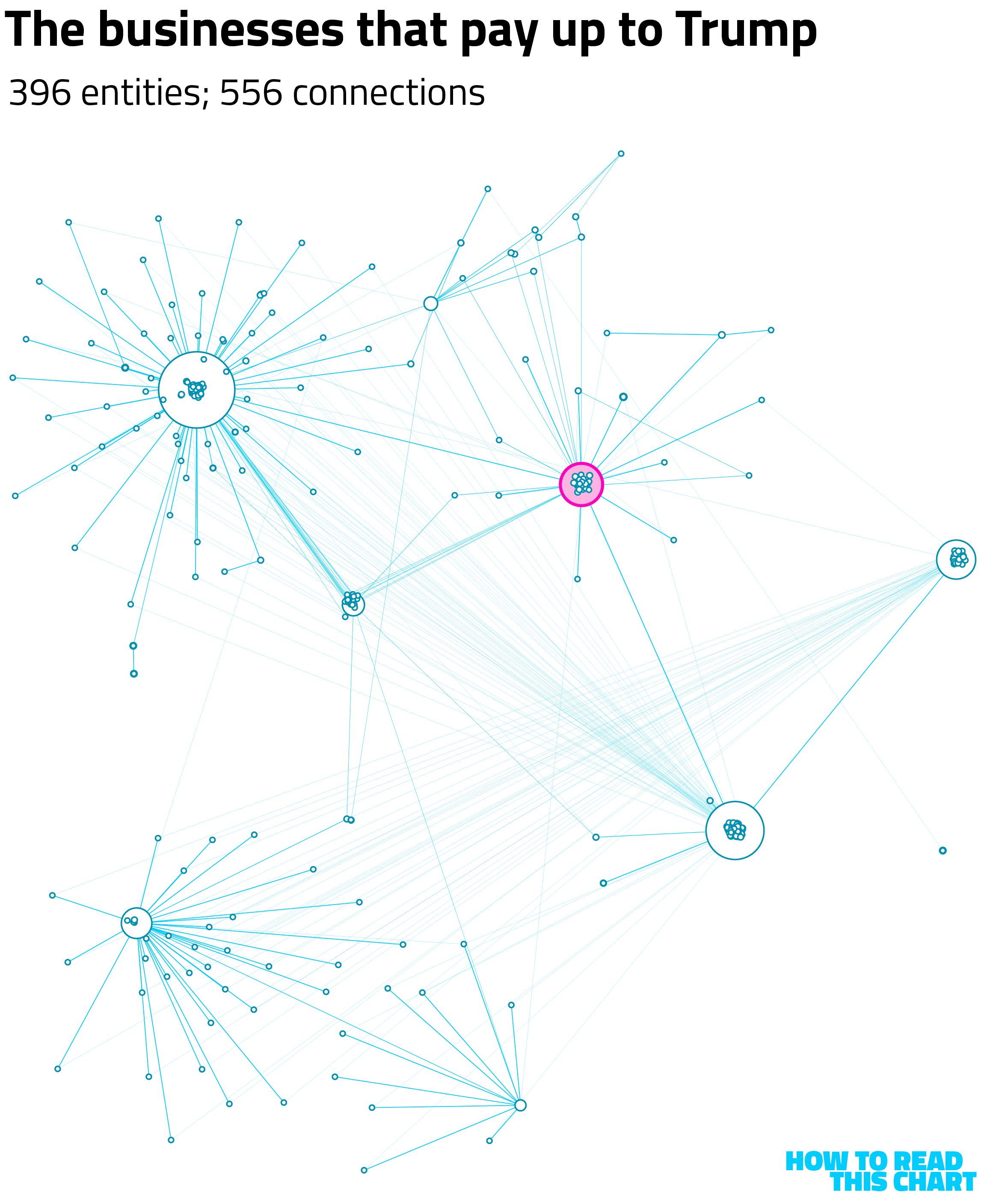 The size of each node on the graph above is determined by the number of other entities in which it has an ownership stake. See, each LLC has one or more owners, creating the lines between the circles. The thicker the line, the larger the stake (from 0.01 percent to 100 percent). To be clear, every node is included because it is identified as being owned by Trump (almost all of them) or owning part of an entity also owned by the president.