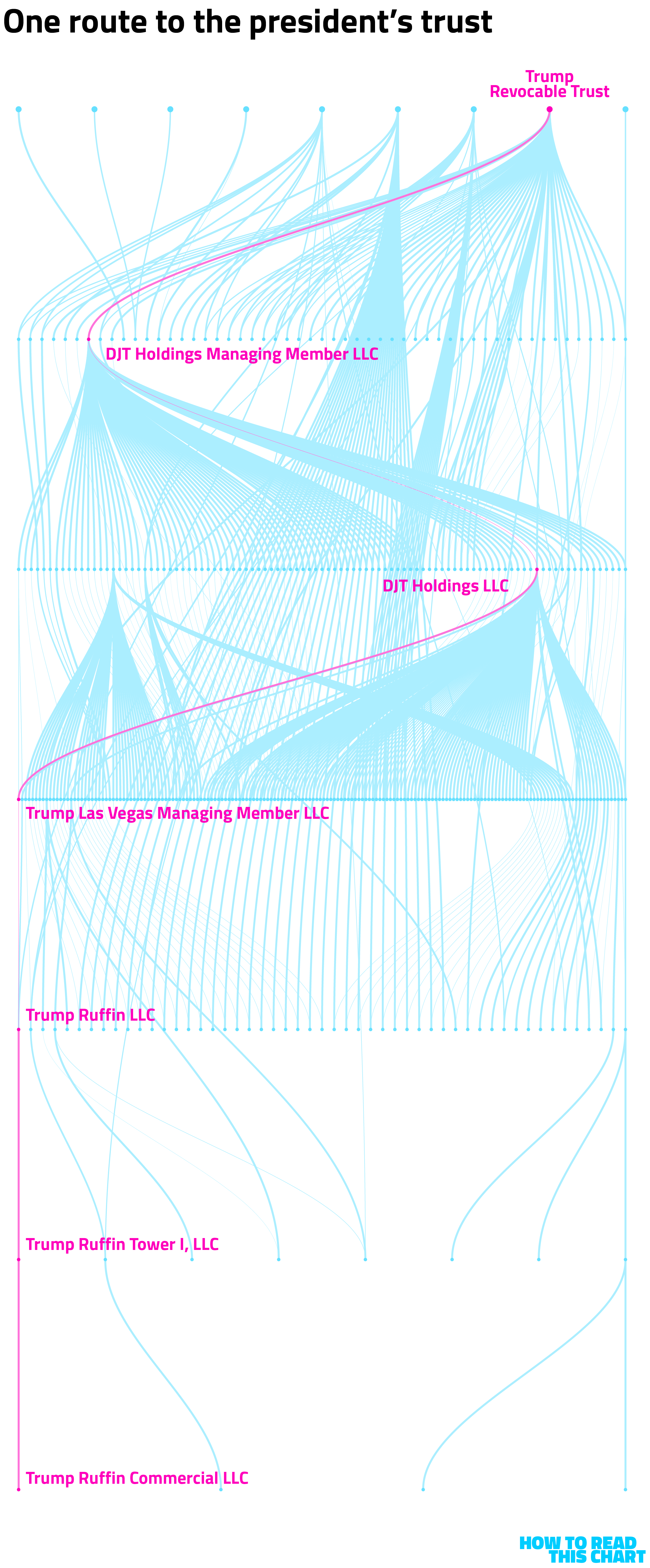 To see how all of this works, consider one of the LLCs that sits furthest from the top. Trump Ruffin Commercial LLC is owned by Trump Ruffin Tower I LLC which is owned by Trump Ruffin LLC which is owned in part by Trump Las Vegas Managing Member LLC which is owned in part by DJT Holdings LLC which is owned in part by DJT Holdings Managing Member LLC which is owned by The Donald J. Trump Revocable Trust.